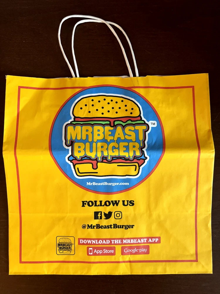 An original yellow MrBeast Burger bag, truly a great collectible from the biggest YouTube creator of all time. The bag is in great condition, no stains and only neat folding lines. Size: Width: 11 3/4inch / 30cm Height when flat: 11 3/4inch / 30cm Material: paper with white paper handles Received from a Mr Beast Burger order in MrBeast's hometown of Greenville, NC in January 2022.