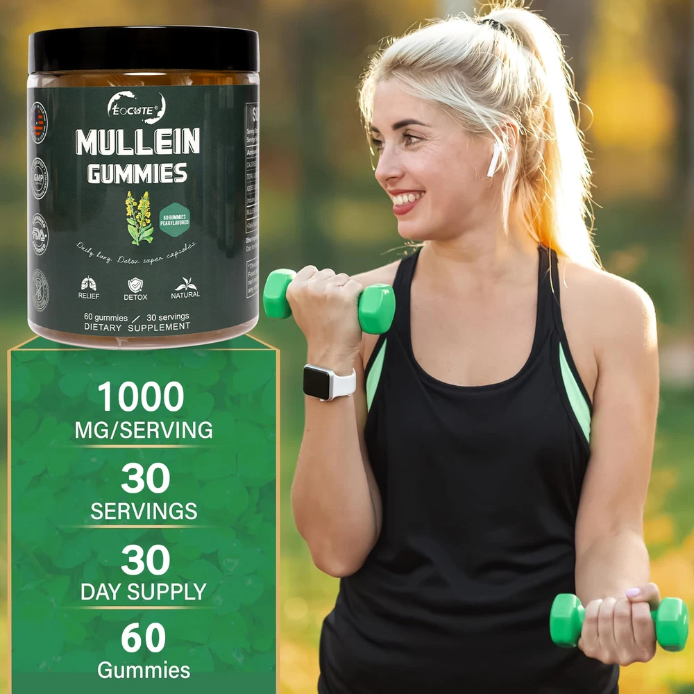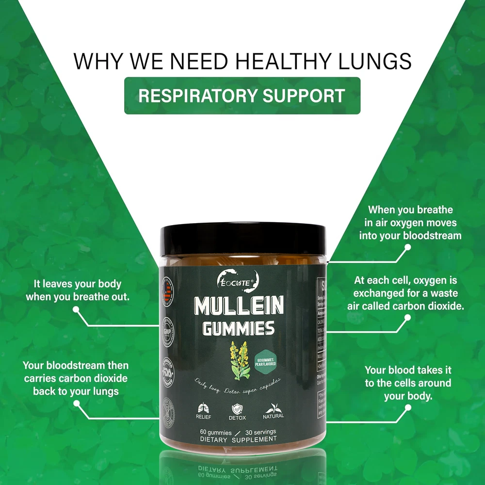 Descriptions: SUPERIOR POTENCY for Lung Support With 2000mg of Mullein, gummies are designed to provide optimal support for your respiratory health. Experience less congestion, easier breathing, and promote overall lung health. BREATHE BETTER: Experience the power of Mullein-enriched gummies, traditionally linked with respiratory well-being. It helps to clear mucus and congestion for easier breathing and is ideal for individuals frequently exposed to high pollution levels or those who are seeking extra support for their respiratory system. Premium & Delicious: We prioritize promoting a healthy lifestyle; unlike traditional maltose and xylitol, our fructose flavor comes from natural bromelain from fresh pineapple, which promotes healthy digestion and immune support for men and women. Pure Wellness, Naturally Enhanced: Our natural mullein gummies are made from pure, freshly picked mullein leaves and plant-based phytonutrient extracts; coupled with our advanced processing, the main active ingredients are carefully extracted. Who Is This For: Whether you smoke, have digestive issues, a weak immune system, want to train harder, walk farther, or maintain a healthy respiratory system; our mullein gummies are a great way to improve your overall health and wellness that you can easily incorporate into your daily routine. Package Included: 1 Bottle of 60 Mullein Gummies