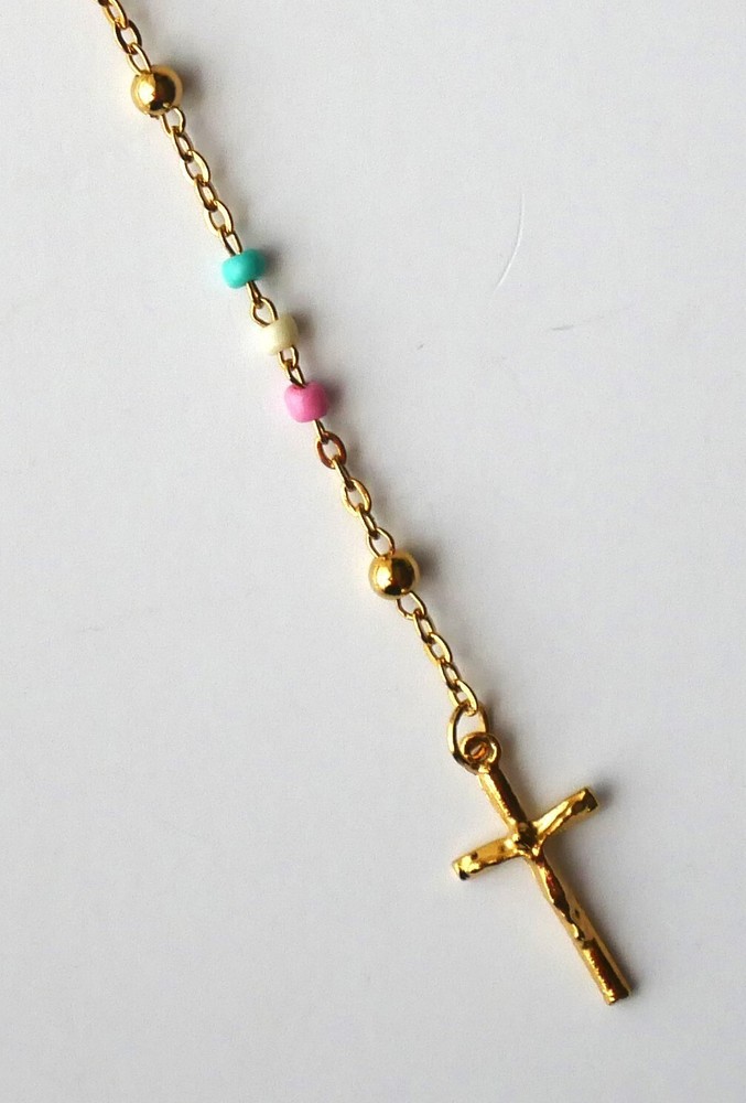Multicolor Beads Miraculous Pocket Rosary This colorful glass rosary features a wide variety of bead colors, a beautiful Miraculous centerpiece and traditional styled crucifix. Makes a great devotional gift for kids and teens who will appreciate the uniqueness of this rosary. SIZE/LENGTH: Total length of the rosary is 14" including the Crucifix. BEADS: Quality Round Shaped Glass Beads carefully assembled on a zinc alloy chain. CENTER PIECE: Image of The Miraculous 5/8" x 3/8" CRUCIFIX: Gold tone Crucifix measures 7/8" x 3/8". Come Visit Us at Our New Store! Please feel free to email me with questions about this item. Also please check my other listings. I am always available to answer your questions promptly. Buy from us with confidence. This is a very good quality and elegant rosary that you can be proud to take anywhere.