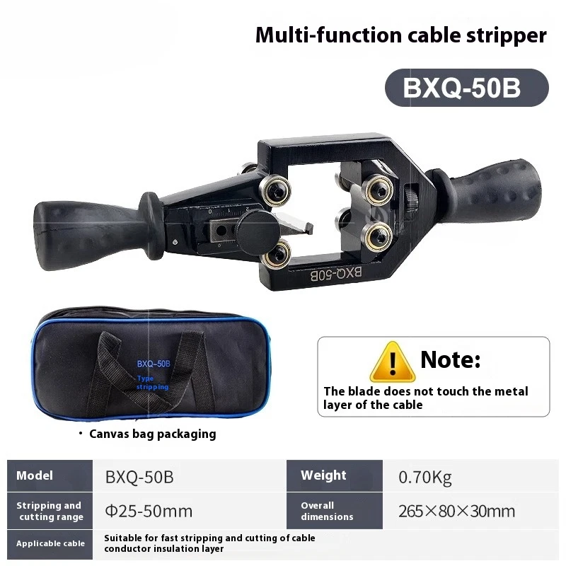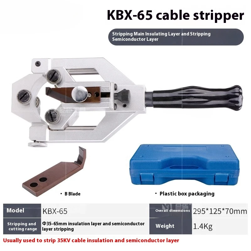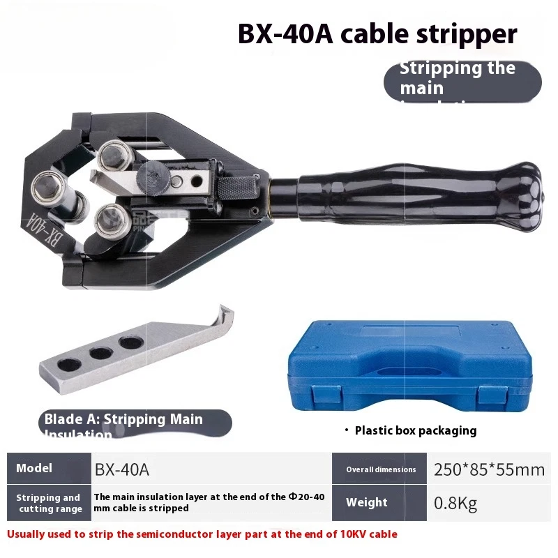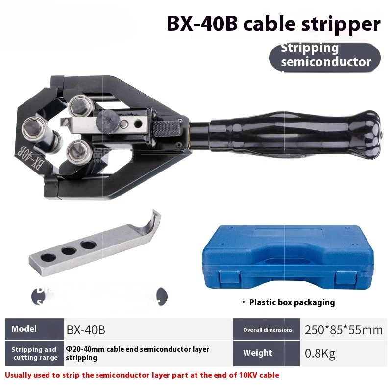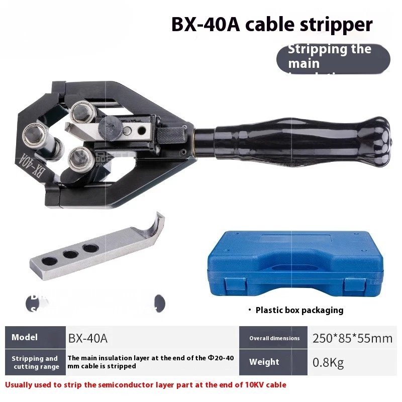 Voltage Cable Peeler Multifunction Wire Stripper Semiconductor Peeling Shears Model: BX-40A/40B Dimensions: 250*85*55 ( mm) Weight: 0.8KG BX-40A : Wire stripper is suitable for stripping the main insulation layer at the end of power cable with a diameter of Φ20-40mm, usually used to strip the main insulation layer at the end of 10KV cable; BX-40B : Wire stripper is suitable for stripping off the semiconductor layer at the end of power cable with a diameter of Φ20-40mm, usually used to strip off the main semiconductor layer at the end of a 10KV cable.