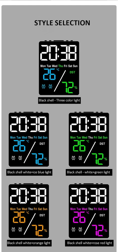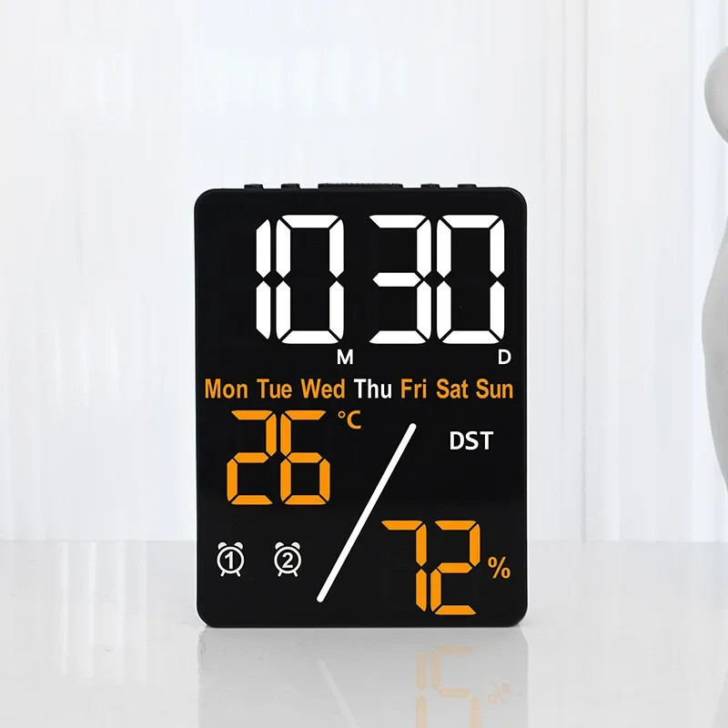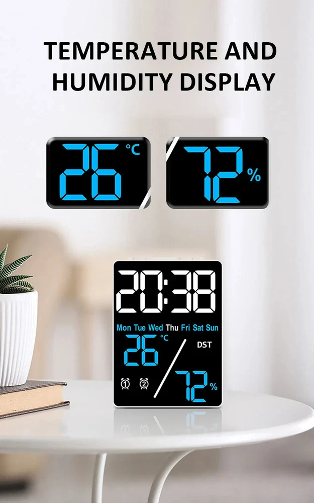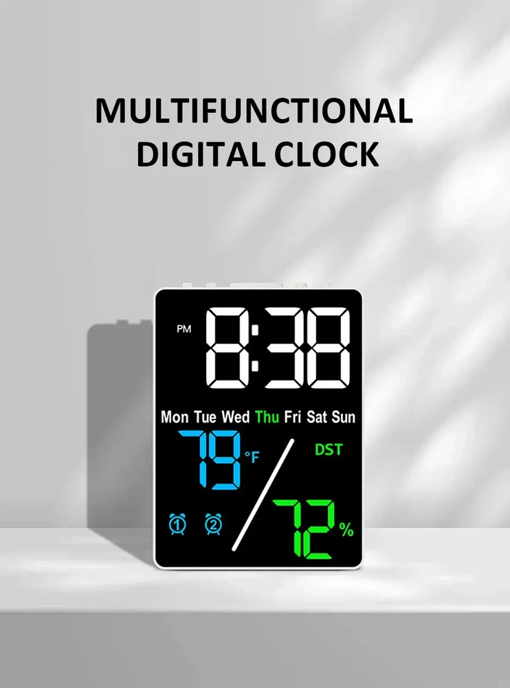Multifunctional Large Screen Digital Alarm Clock Humidity Display Brightness Adjustment Charging Desktop Clock Home Office Decor Features: Dual Alarm Clocks: You can set two alarm clocks in different time periods (such as weekdays and weekends), which can help you plan your time reasonably. 3 Levels of Brightness Adjustment: This alarm clock has 3 levels of brightness adjustment, and also adopts a high sensitivity photosensitive sensor, which can automatically sense the ambient light and adjust the brightness of the display. The stronger the ambient light, the brighter the backlight, and the weaker the ambient light, the dimmer the backlight. Perfect Gift: It is not only a clock, but also a good decoration for your bedroom. The stylish appearance and multiple functions make it perfect as a gift. Dual Power Mode and USB Ports: This product can be powered via the supplied USB cable or by installing AAA batteries (not included). When powered by the USB cable, there are two USB ports on the back, one for put and one for output. Note: AAA battery mode can not output charging. Specifications: Item Name: Digital Alarm Clock Material: Plastic Output: 5V 1A Color: as the picture Display Screen: LED Applicable Places: Home, Room, Outdoor, Office, Meeting Room, Bedroom, Places Where an Alarm Clock is Needed Size: 9cm x 2.5cm x 12cm(Approx.) Package Includes: 1 x Digital Alarm Clock 1 x USB Cable (Battery not included in package) Note: Due to different lighting and screen settings, the item color may be slightly different from the picture. Due to different manual measurements, please allow a 1-2cm difference in size. 1. Use carbon batteries; can not use alkaline batteries, overcharge is too strong to burn off the power supply (broken words, display incomplete) will shorten the life of the electronic clock 2. Adapter (plug) with 5V 1A, can not use fast charging, can not use the charging treasure, can not be used in the computer host, can not use the bull socket, will cause voltage instability, resulting in time is not allowed, the current is too strong will burn off the power supply (broken words, display incomplete) will shorten the life of the electronic clock!