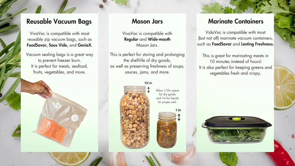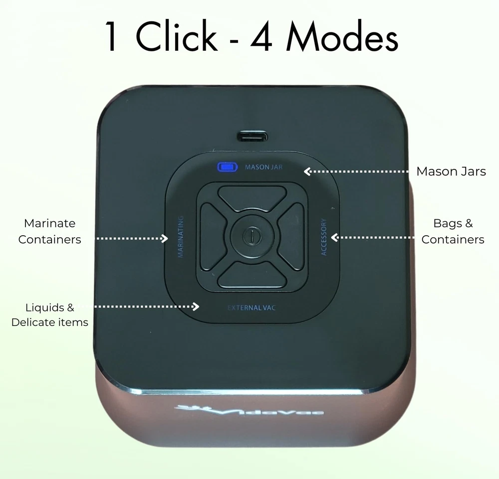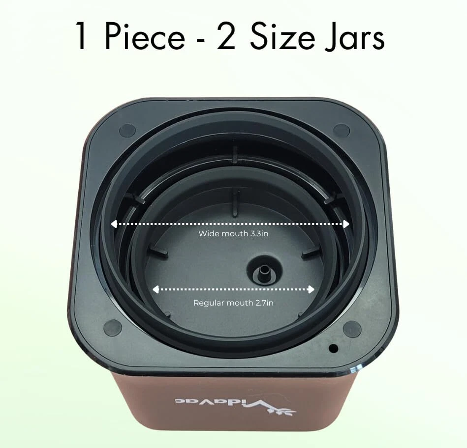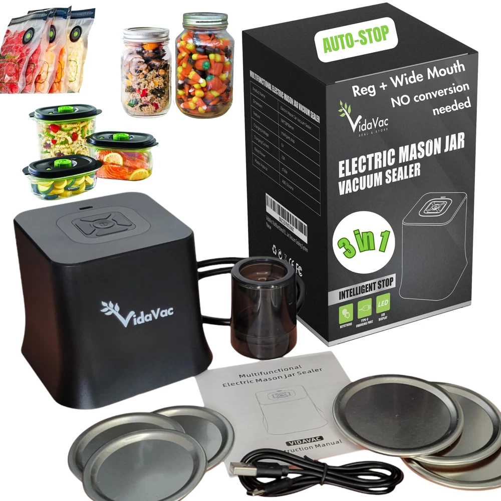 Meet , the sleek solution to your food preservation needs. This innovative Multifunctional Mason Jar Vacuum Sealer is a game-changer for anyone looking to extend the shelf life of their food while maintaining optimal flavor and freshness as well as for anyone who values avoiding food waste and saving money. Crafted for convenience, this electric, rechargeable gadget is the hero your kitchen didn’t know it needed. Whether you're sealing regular or wide-mouth mason jars, food containers, or storage bags, its universal compatibility has got you covered. It's been designed to slide into your kitchen routine hassle-free with a minimalist aesthetic, ensuring you can say goodbye to bulky machines. Its one-touch operation simplifies the vacuum sealing process, automatically ceasing once the air is fully evacuated, thanks to its intelligent 'Smart Stop' feature. Add to your kitchen and unlock the full potential of your pantry/fridge – because good food deserves to be kept that way. And join the movement toward a fresher, tastier, and more sustainable way of life. If your fails to bring freshness and convenience to your kitchen, please contact us and we will immediately address any problems you may have and provide you with a satisfactory solution. That, we guarantee! Included in your package: *1 sealer (regular and wide-mouth compatible) *1 suction cup for bags and containers *1 tube for suction cup connection to sealer *3 regular mouth mason jar lids (7cm) *3 wide mouth mason jar lids (9cm) *1 USB-C charging port *1 instruction manual Convenient and Easy to Use - Electric, rechargeable, cordless, and lightweight. It operates without the need for a separate external compressor or bulky equipment, allowing for quick and easy sealing of mason jars, containers, and bags. The rechargeable feature eliminates the hassle of dealing with cords and power outlets, making it suitable for use in different settings, including the kitchen, outdoor activities, camping, or while traveling. Multifunctional and Versatile - Allows you to conveniently vacuum seal a variety of options. With compatibility for regular and wide-mouth jars, as well as other types of containers and bags. This versatility makes it a valuable addition to any kitchen, providing the convenience of sealing and preserving different types of food packaging without the need for separate equipment. Smart Stop Function - This feature allows the machine to detect the optimal vacuum level for different types of jars and containers, preventing the guessing game and over/under compression. The smart stop function also simplifies the sealing process as it eliminates the need to manually monitor and stop the vacuuming process, providing a hassle-free experience. By automatically stopping at the perfect vacuum level, this feature helps maintain the integrity of the sealed items and ensures consistent, reliable results with every use. Space Saving and Storage Efficiency - The airtight seal created by the vacuum sealer prevents the need for bulky traditional storage containers, as well as excessive packaging materials, allowing for a more compact and streamlined storage solution. Additionally, vacuum-sealed Mason jars can be stacked efficiently, optimizing the use of shelf and refrigerator space. This space-saving attribute makes the vacuum sealer an ideal choice to help you declutter the kitchen and make the most of available storage areas. Money Saving - Helps avoid food spoilage and waste, allowing you to make the most of your groceries and leftovers. Additionally, it provides you the ability to buy food in larger quantities and preserve it for longer periods leading to even more savings over time. Increas Shelf Life & Preserve Flavor and Freshness - By creating an airtight seal, vacuum sealing prevents oxygen from reaching the food, which in turn slows food spoilage. This process can help keep food fresh for longer periods, making it a useful tool for storing a wide range of perishable items such as smoothies, sauces, jams, fruits, vegetables, dehydrated foods, and even leftovers. Eco-Friendly - Minimize food waste and contribute to environmental sustainability. Reducing the amount of food that ends up in landfills helps curb methane emissions and conserves resources used in food production. By promoting efficient food preservation and storage, the use of a vacuum sealer aligns with efforts to minimize environmental impact and promote sustainable practices in the kitchen. CUSTOMER SATISFACTION – If you are not 100% satisfied, have any questions, or need any assistance with your , please contact us. We are here to help!