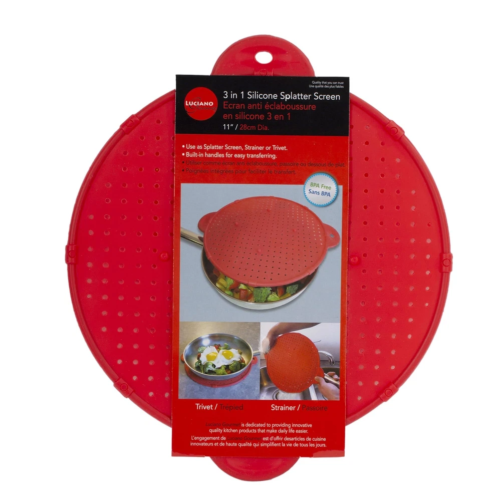 You can totally avoid the mess when frying chicken breast or making a schnitzel with Luciano Houseware’s silicone splatter screen. It can be used to solve three different problems: keeping oil from splashing onto the counter, cover your cooking pot while still releasing some air and steam, or using it as a strainer for rinsing food. The splatter screen is made of high-quality, durable and natural silicone material that withstands high temperatures and is dishwasher safe. It comes with handles on both sides to makes sure you do not burn your hands when dealing with boiling water. This kitchen accessory is a must-have when you are cooking breakfast, lunch or dinner. MEASUREMENT: The splatter screen measures 11" in diameter, will perfectly cover any medium-sized pan MATERIAL: Made of high-quality, durable BPA-free silicone and a reinforced stainless-steel frame that promises durability and a long lifecycle DESIGN: The fry pan splatter screen has been developed with a smart design that will make sure you cook safely protecting from the dangers of hot oil and avoid any mess on your counters FEATURE: Comes with ergonomically designed silicone handles on both sides to make sure you can easily lift the splatter from a hot pan without burning yourself VERSATILE: The non-stick and heat-resistant cooking splatter screen is great to use while simmering food to maintain a stable heat level, it can be used as a drainer or trivet for hot pans, pots and plates