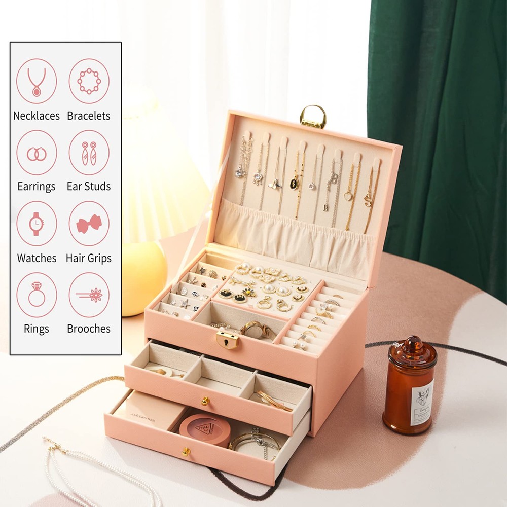 MULTI-FUNCTIONAL STORAGE: The three-drawer jewelry organizer provides ample space to organize and store different types of jewelry, including necklaces, rings, earrings and more. It helps you keep your jewelry organized and easy to find the accessories you need. SECURITY PROTECTION: The storage box is equipped with a lockable design to keep your jewelry safe and protected. You can lock the box with a special key to avoid losing your jewelry or having it touched by others EXQUISITE DESIGN: The jewelry organizer is made of high quality materials and has a beautiful and elegant appearance. The inside of the box is meticulously designed with dividers and compartments so that each jewelry can have its own space to avoid collision and entanglement with each other. PORTABLE DESIGN: The organizer is of moderate size, easy to carry and travel with. Whether for home use or for travel, you can always take your jewelry with you and show your style. Exquisite details: every detail of the jewelry organizer has been carefully examined. The drawer is designed with a smooth slide for easy opening and closing; the interior is filled with soft velvet material to provide gentle protection for jewelry EXQUISITE APPEARANCE: The jewelry organizer is designed with a simple and stylish appearance, which adds a sense of style and elegance whether you place it at home or take it out with you. It is also a great gift option for family, friends or jewelry lovers.