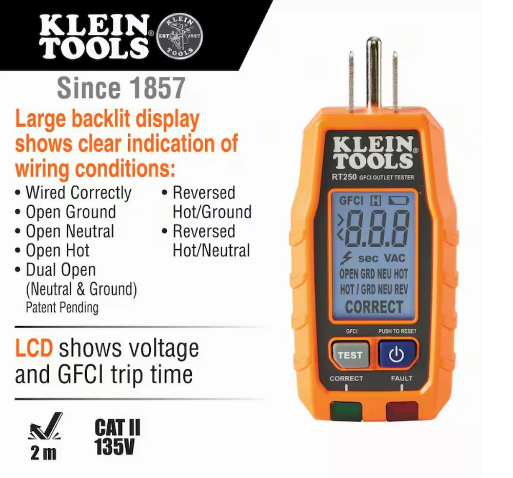 About This Product Klein Tools Premium Electrical Test Kit includes a Manual-Ranging Digital Multimeter (Cat. No. MM320) with right-angle test leads, Dual Range Non-Contact Voltage Tester with Flashlight, 12 to1000 VAC (Cat. No. NCVT3P), and a GFCI Receptacle Tester with LCD (Cat. No. RT250). This convenient kit features products for a variety of applications with safety and reliability in mind. Comes with all required batteries. Highlights Electrical Kit with Premium Testers solve various electrical applications; Manual-Ranging Digital Multimeter, Dual Range Non-Contact Voltage Tester with Flashlight, and GFCI Receptacle Tester with LCD Digital Multimeter MM320 measures up to 600V AC/DC voltage, 10A DC current and 2MOhms resistance; also tests batteries, diodes, and continuity Voltage Tester NCVT3P has dual-range capabilities to detect from 12 to 1000 VAC or 70 to 1000 VAC for a broad variety of low-voltage or standard voltage applications Bright flashlight illuminates work area and may be used independent of voltage detection function GFCI Receptacle Tester RT250 features a large backlit LCD readout of voltage, and clear indication of wiring conditions, including patent pending detection of Open Neutral / Open Ground wiring faults LCD readout on receptacle tester shows the time required to trip a GFCI device; for use on 3-wire, North American 120V electrical outlets only Digital Multimeter MM320 includes right-angle test leads and all required batteries MM320 is CAT III safety rated for 600V Details Electrical Tools Features Audible Alert, Battery Powered, Dual Voltage Indication, Grounded Receptacle, Handheld, Interchangeable Leads, Noncontact Detection, Visual Alert Hand Tool Type Electrical Tool Set Number of Pieces 3 Returnable 90-Day Tools Included Electrical Tester Tools Product Type Hand Tool Warranty / Certifications Manufacturer Warranty Please refer to the attached warranty document in the Product Overview section above under Info & Guides.