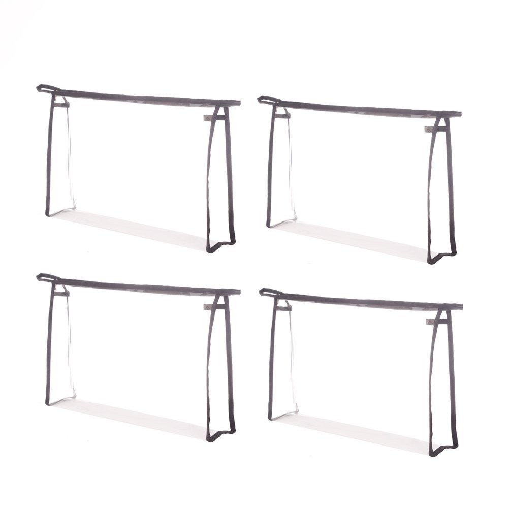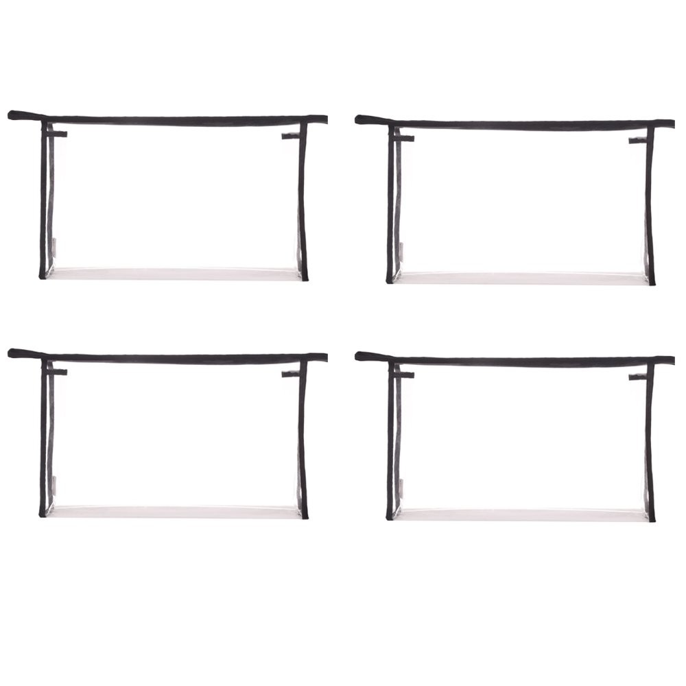 These durable, lightweight bags can be used for make up, jewelry, and other small travel items, They can also be used for Wedding, Birthday Party gift packaging, etc. The transparent design allows for a quick glance at contents inside, easily fit into your suitcase, handbags or backpack. 4 sizes bag available as: 13" x 2.5" x 7.9", 11" x 2" x 7", 7.9" x 2" x 5.7" and 9.8" x 2" x 4.3". each pack contains 4 pouches. High quality durable and soft clear PVC, waterproof, easy to clean Transparent design allows you to easily see what you need and where it is. Dimension 9.8" x 2" x 4.3" Trim color: Black Great for carrying makeup, hair accessories, shaving tools, cosmetics, meds, shampoo, conditioner, soap and all other traval items, Also great for use at home for organize and miscellaneous items. Each set contains 4 bags