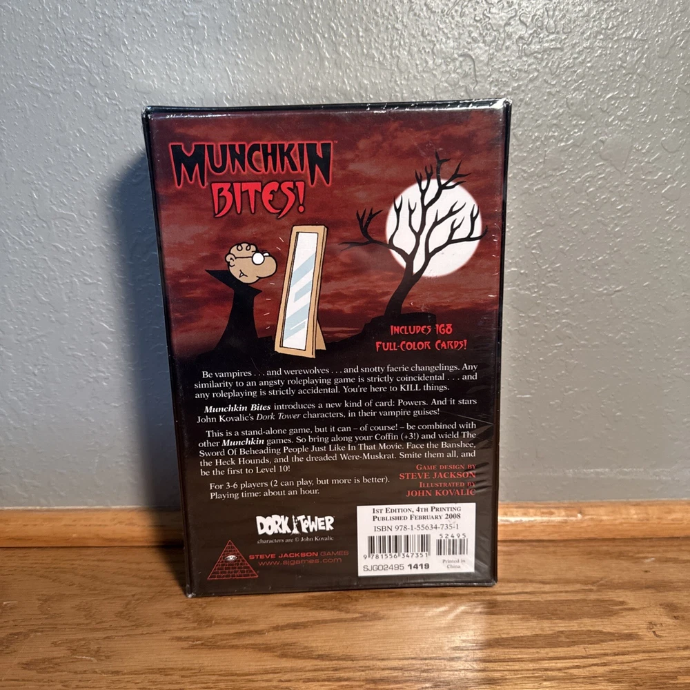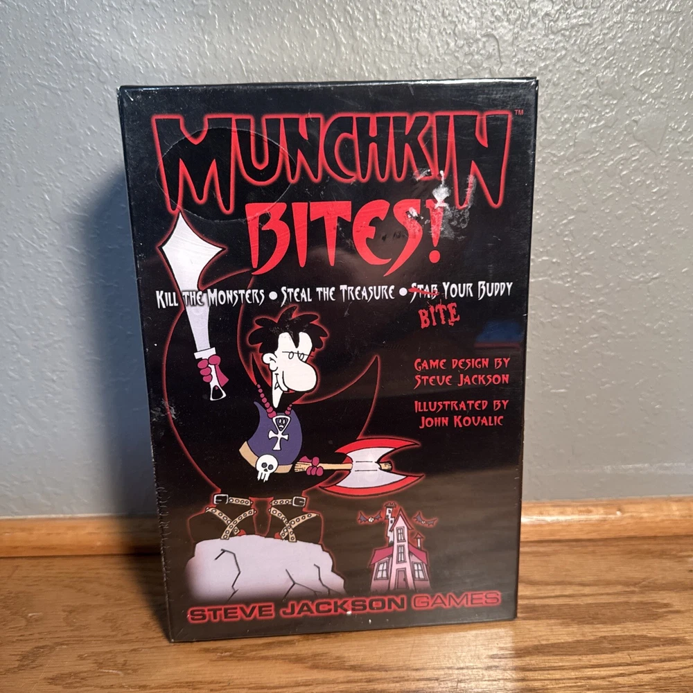 The product is "Munchkin Bites!" by Steve Jackson Games, a board game released in 2004 with a horror and monster theme. It is a complete game designed for a minimum of 3 players. This is the 1st edition of the game, new and sealed, offering free combined shipping.