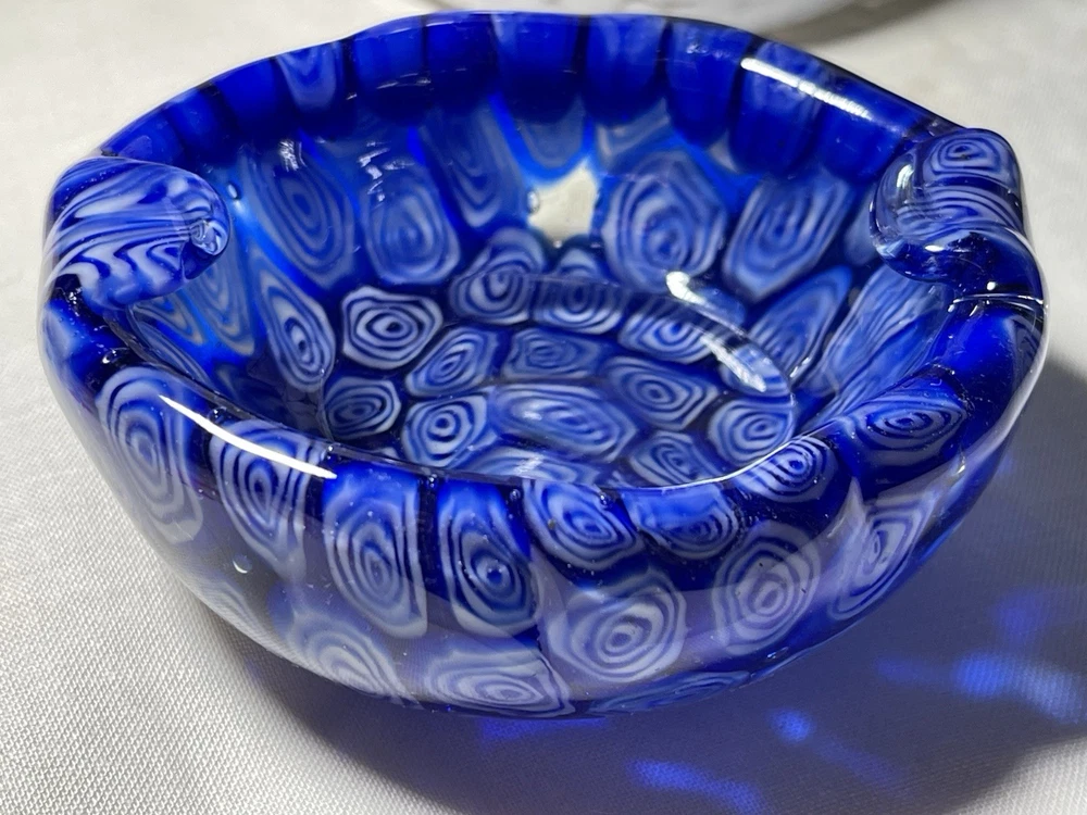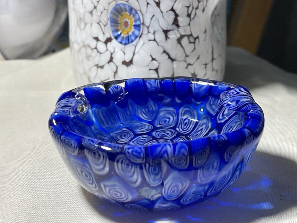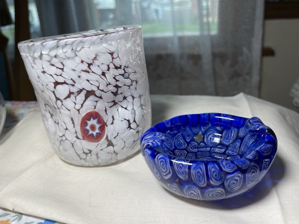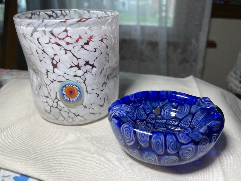 Great looking art glass pairing. There are 3 different color Millefiore glass fusings on 3 sides of the candle holder. It could be a tumbler as well. Candle holder/Tumbler is 4 inches high and 4 inches wide. A 3 by 3 in pillar candle fits in it perfectly. Weight is 7 ounces Ashtray is 3.5 inches long, 3 inches wide and 1.5 inches tall. Weight is 8 ounces
