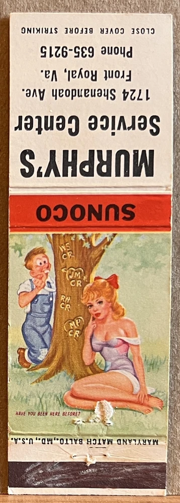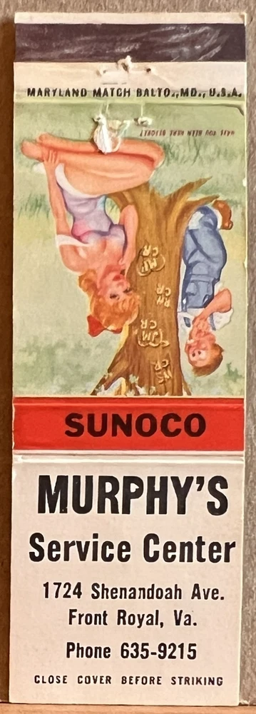 Vintage front-strike matchbook cover advertising for Murphy's Service Station, Front Royal VA Virginia. Sunoco Gas. Hillbilly. Measures approximately 1.50" x 4.50". Matchbook is in good used condition with surface wear, soiling/stains, creases and bumped corners. Tape residue on reverse. No matches.