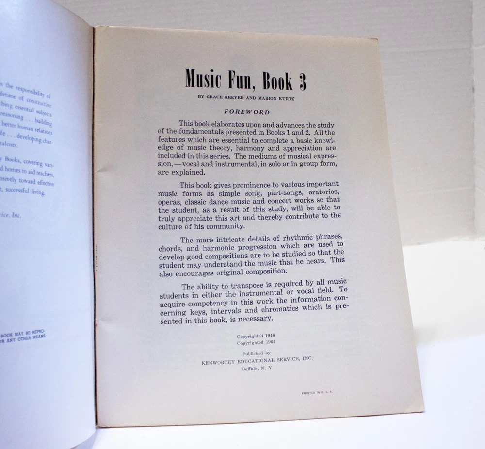 Music Fun Appreciation Theory Book 3 by Marion Kurutz and Grace Reever A Kenworthy Activity Book Softcover/Paperback Illustrated Instructional Music Book 1964 Very Good Condition Author: Marion Kurutz & Grace Reever Publisher: A Kenworthy Activity Book Format: Paperback/Softcover. Illustrated. Release Date: 1964 Dimensions: 10.75 x 8.25 x <0.25 in Weight: 7 oz No. of Pages: 112 Pages Condition: Pre-Owned in Very Good Condition. Some discoloration particularly to the back cover (which is all white), but the book otherwise has no flaws. No writing on the pages within. Book is structurally sound. Please see photographs for details as they are considered part of the description. SYNOPSIS: This book is a valuable addition to any music lover's collection. It covers the topic of music appreciation theory in an engaging and informative manner. With a focus on English language, this paperback book is perfect for anyone interested in music theory. Music Fun Appreciation Theory, Book 3, is a must-have for anyone looking to expand their knowledge of music. **Smoke Free Home**