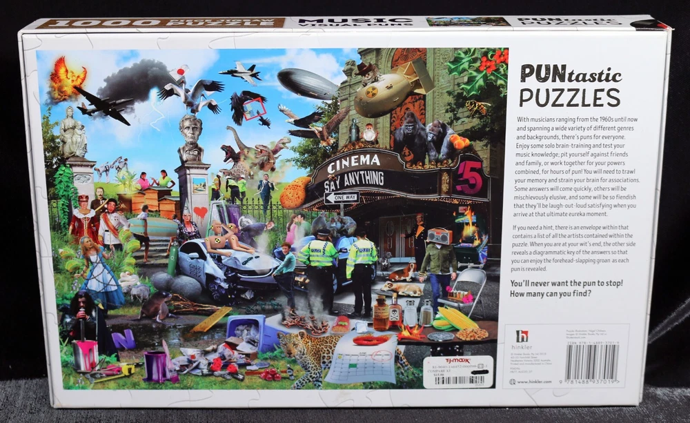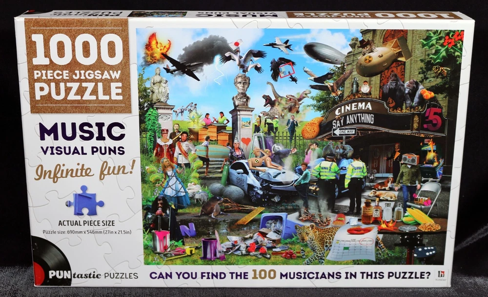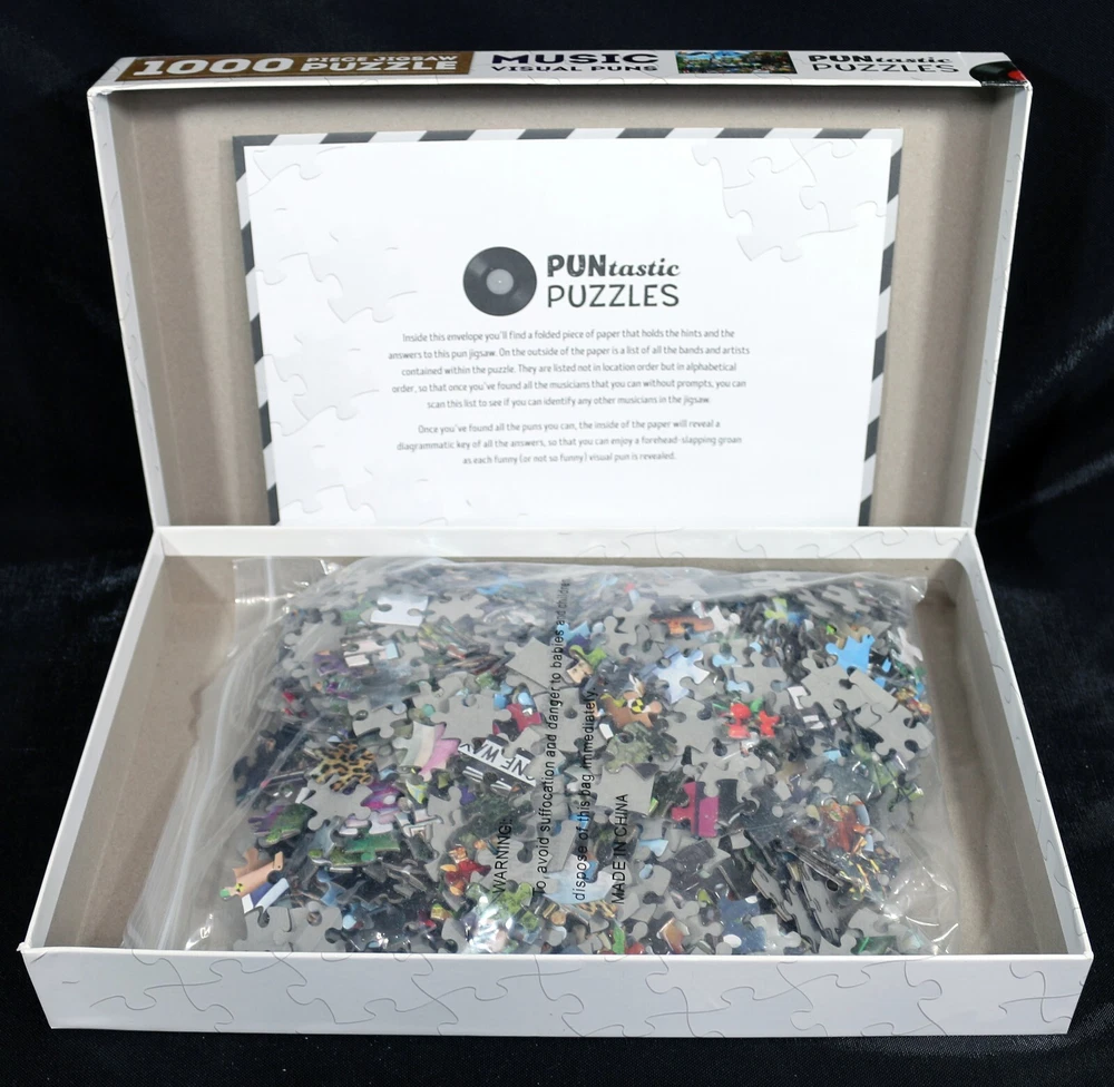 Get ready to put your puzzle-solving trivial skills to the test with this 1000-piece jigsaw puzzle from Puntastic Puzzles. Featuring a colorful and lively design of musicians' groups that you have to figure out via the "visual puns" that are presented in the puzzle. This puzzle is sure to bring hours of entertainment for anyone aged 12 and up. The puzzle is made of high-quality cardboard and comes complete with a hint sheet, making it an ideal addition to any trivia puzzle collection. Measuring 27 inches by 21.5 inches when completed, this puzzle is not only fun to solve but also makes for a great decorative piece. The puzzle comes from a smoke-free home. So, put your hands together and get ready to rock and roll with this Music Visual Puns puzzle! Doing puzzles has some hidden benefits Excellent qualities : Cultivate concentration, patience, and temper your will Movement development : Train hand-eye coordination and precise small movements Spatial intelligence : Improve visual discrimination of colors and shapes Critical thinking ability : Understand the relationship between parts and the whole, and draw inferences from one example to explore the future Relaxes your mind : Relieve work pressure and release yourself Brain development : Enhance memory and may help prevent or slow brain degeneration Puzzle pieces are all bagged. Each item we ship is carefully packaged to prevent any damage and is shipped immediately with tracking. Anticipated Benefits of Puzzles for Children Overcoming attention deficit Strengthening visual memory Improving problem solving skills Strengthening hand-eye coordination Improve fine motor skills Improve gross motor skills Shape recognition ability Gain the ability of setting goals Learning patience