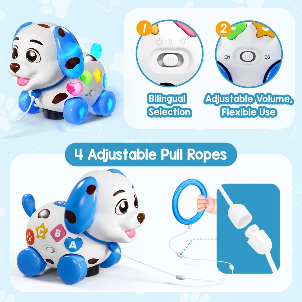 Musical Toy for 1 Year Old Boy Girl, Baby Toys 6-12-18 Months, Puppy Toddler Learning for 1 Year Old Girl Gift, Bilingual Educational with Music Light, 1st Birthday Gift for Boy, Toddlers Musical Learning Toy for 1 Year Old Boy Girl: With adorable sounds, delightful song, and twinkling lights, this musical toddler toy is designed for toddlers 1-3 and baby 12-18 months to learn numbers 1-3, letters A, B, C, 3 animal sounds, along with songs of number and letter Crawling and Walking Baby Toy: Attracted by various music and colorful lights, baby 6-12 month, 9+ months will try to crawl after this musical toy when it walking around with music playing. This baby toy 12-18 months also help baby and toddler 1+ year old to walk. It come with 4 ropes, it is a adjustable length pulling toy and the pull-along feature encourages mobility and coordination Bilingual Educational Toy 1 Year Old: With English and Spanish Mode, your one year old boy and girl can learn number, letter and songs with dual language. 1 year old boy toy, bilingual toy for 1 year old girl. With 2 level of volume, this musical puppy toy is toddler-friendly Developmental and Sensory 1+ Year Old Toy: With charming and captivating puppy figures, vibrant colors, pleasant sounds, and entertaining songs, this musical learning toy for one year old girl provides visual, auditory, and tactile stimulation for your toddler 1 2 3 year and baby 6-12-18 months, enhancing their sensory cognition Ideal 1 Year Old Boy Girl Birthday Gift: Made of ABS, safe and durable. It is perfect for 6-9-12-18 months baby, toy for 1 year old girl gift, 1 year old girl toys, first birthday gift for boy, Christmas gift for 1-3 toddler Shipping We offer FREE shipping on all orders! We ship within Three business days of payment, usually sooner. We use a selection of shipping services such as UPS, FedEx, USPS etc. We only ship to the lower 48 states, no APO/FPO addresses or PO Boxes allowed. Local pickups and combined shipping options are not provided at this time. Return You can return a product for up to 30 days from the date you purchased it. Any product you return must be in the same condition you received it and in the original packaging. Please keep the receipt. Payment We accept payment by any of the following methods: PayPal Please pay as soon as possible after winning an auction, as that will allow us to post your item to you sooner! Feedback Customer satisfaction is very important to us. If you have any problem with your order, please contact us and we will do our best to make you satisfied. Contact Us If you have any queries, please contact us via ebay. We usually respond within 24 hours on weekdays. Please visit our eBay store to check out other items for sale! Thank you for shopping at our store.