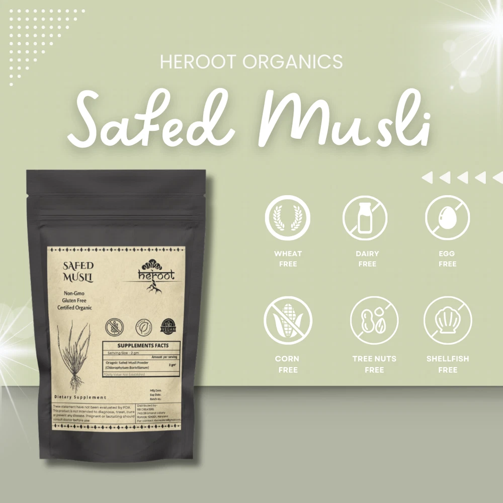 Heroot Organic Safed Musli Powder Safed Musli helps to increase strength, immunity. An ancient ingredient that is traditionally used for enhancing strength and stamina. Safed Musli is an ancient ayurvedic herb primarily used as a tonic and rejuvenative for the reproductive system. It may be beneficial in managing premature ejaculation, impotence and low sperm count in men. Key Ingredients: Safed Musli Key Benefits: · It helps in enhancing vigour and vitality in the body It may be useful in improving libido · Useful in maintaining overall strength and performance · Beneficial in body building and increasing body strength It helps in relieving stress in the body Directions For Use: Consume 1/4 tsp (3-5 gm) with lukewarm water after a meal Or as directed by your healthcare provider How To Consume: Can be mixed with warm milk & honey Can be taken with juices & smoothies Can be taken directly with honey · Can be filled in capsule and consumed with water Safety Information: · Store in a cool dry place · Keep out of reach of children · If you are pregnant or lactating or prone to any food allergy or under any medical condition consult your healthcare practitioner before use Disclaimer The above description is for information and knowledge purpose, not a healthcare professional advice. Please consult your doctor and/or pharmacist before you take this vitamin. Pregnant or lactating women, diabetics, hypoglycemics, and people with known medical conditions and/or taking drugs, should consult with a licensed physician and/or pharmacist prior to starting any supplementation program. The above statements have not been evaluated by the Food & Drug Administration. Shipping and Handling 1. Shipping time will be 1 business day after the cleared payment 2. We will ship by Indian Post service 3. Shipment will take 15-30 days. Few more days for your local customs delay and formalities. 4. For Express service additional charges will be applied. For any reason you wish to leave Negative or neutral feedback, Please contact us first and let us mutually resolve it. We care for your satisfaction and will make sure that you are happy with the transaction to post us 5**** ratings in all areas. ***Customs Information*** Heroot will not be liable for packages refused or held by customs for delivery. We request that you contact customs office and ask about import regulations and restrictions before placing your order. It is importsnt for you to become familiar with customs policies for your specific country before ordering. Customs regulations differ by country and not knowing their regulations can result in your order incurring high import duties, the delivery being delayed or even returned. Please check with your customs office to see if your country permits the shipment of the products you are planning to order from us and if any additional licenses or permits are needed. Please note: if your order is returned to us due to banned/ restricted products policy, a wrong address, refusal to pay customs fees, refusal to accept the order or because no one was there to accept the delivery of your order, we will refund your order as follow: you will be refunded the total amount of the order, minus the original shipping charge .