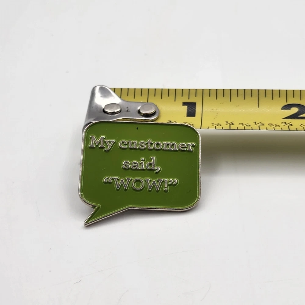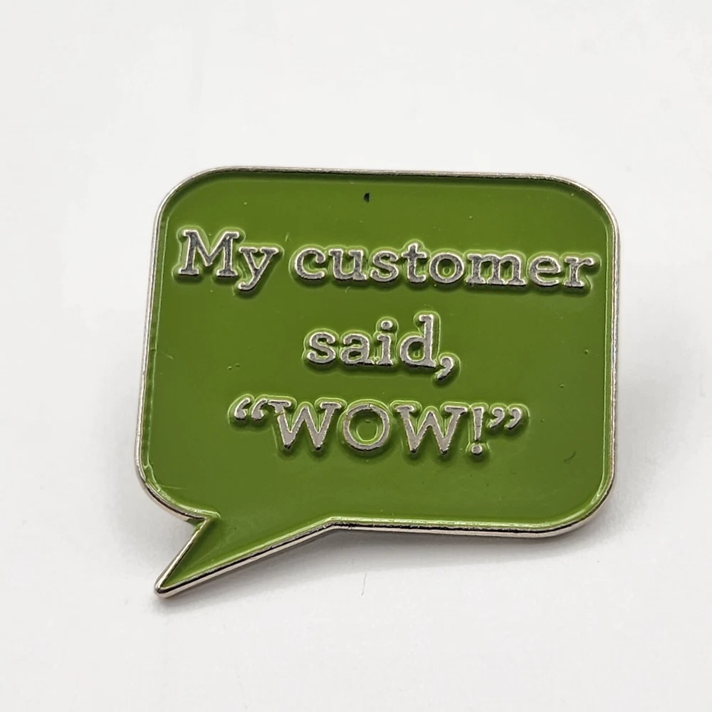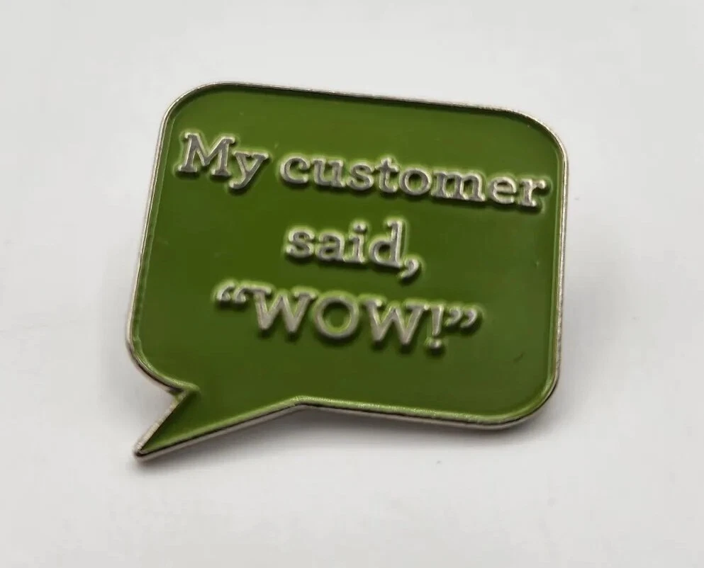 Good preowned condition. Measurements shown in photos. See photos for additional details. My Customer Said, Wow Employee Lapel Pin Customer Service Green Silver Tone.