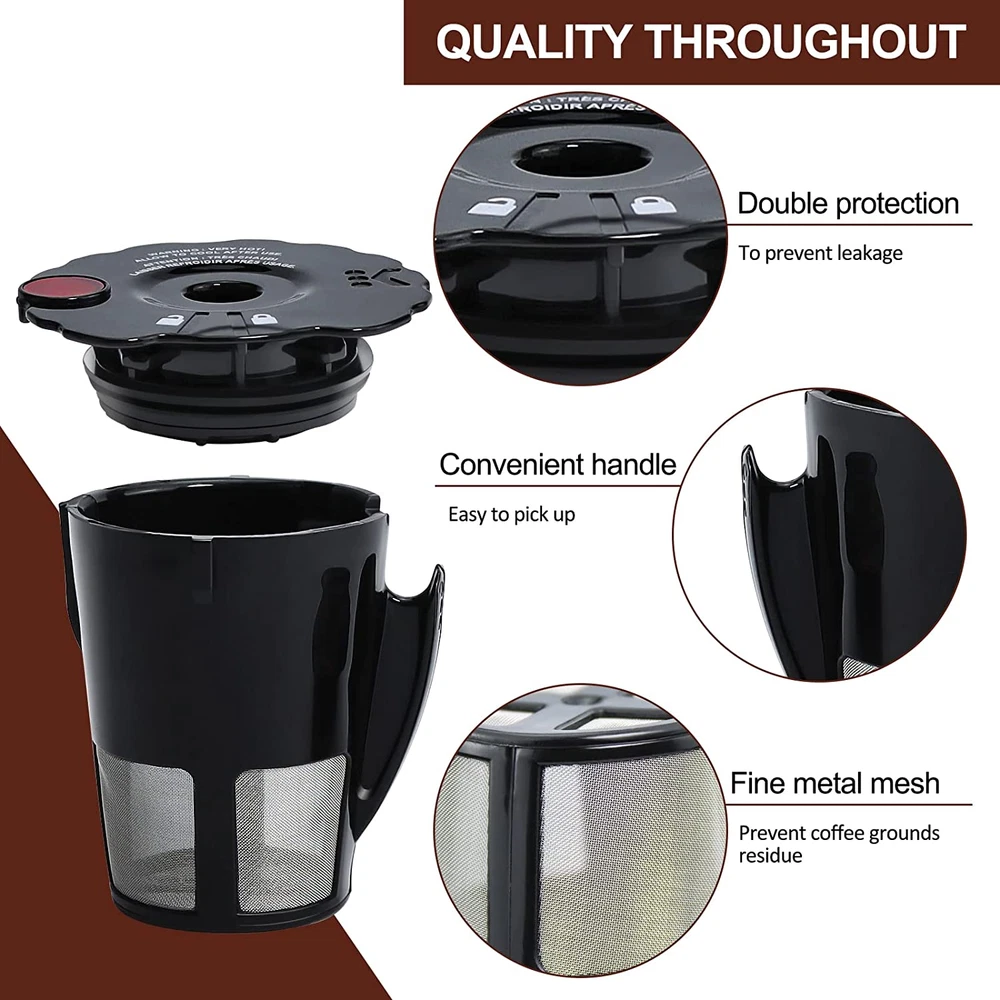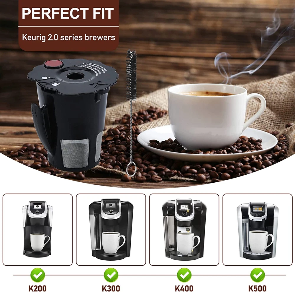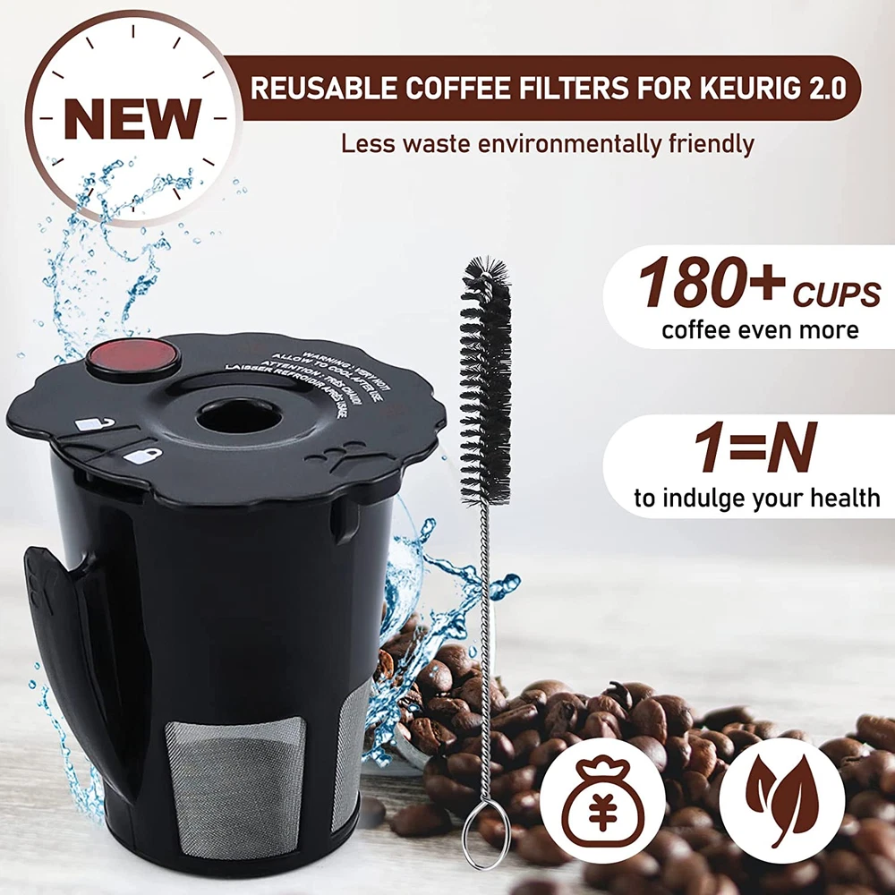 COMPATIBLE WITH MODELS SPECIFIED FIT FOR KEURIG 2.0 REUSABLE K CUPS: Model Number: 119367 reusable coffee filter. Compatible Brands: Reusable k cups coffee filter fit for keurig 2.0 K200, K250, K300, K350, K400, K450, K460, K475, K500, K550, K560 , K575,etc. Size of Reusable K Cup Coffee Filter: Large size fit perfect for 4oz to 12oz K-Cup brew ( specific depending on your coffee brewer model) !Please check the size carefully before purchase, the old product and the new product are the same size (Figure 3 size details) DIMENSIONS: To avoid buying the wrong Cup Reusable Coffee pods, they need to be the same size, Our base is 1.4in diameter and 2.53in height,Feel free to contact us to check the model compatibility. We will be happy to assist you. QUALITY THROUGHOUT: Reusable k cups fit for keurig is made of 100% safety food grade material to pamper your health, which providing you with a hassle-free, convenient, fill-and-brew experience! well made, no need to worry crack and shatter. Fine metal mesh efficient for brewing, drips with a perfect stream to prevent coffee grounds residue. Helping produce the delicate and silky taste feeling you ever had EASY TO USE & CLEAN: Double guarantee to prevent leakage: lock / unlock position lids to keep seal is tight, just have to make sure you hear the snap when you lock them.And rubber band the lid adds fit for keurig 2.0 reusable k cups tightness and adhesion. Clean well: as long as you clean it out right away you will not have any issues with discoloration or build up. Do not hesitate, delicious immediately GREAT SAVE MONEY: Reusable coffee pods filter fit for keurig is BPA free. According to the authoritative test report shows each of people could brew 180 cups coffee even more. Use this reusable coffee filters fit for keurig 2.0 less waste economical and practical than using plastic throw away cups. Replacement for Keurig reusable coffee pods filter are included in package, which reduce your drinking cost WHAT YOU GET: Packaging includes: 2 * 119367 kuerig 2.0 Reusable Coffee Filter. (The most practical combination method, more convenient to replace during cleaning. So even if you have two 2.0 fit for Keurig at home, work or anywhere you might be others, our reusable k-cups will help you enjoy your fantastic brews) PRODUCT CONFIDENCE: We have always adhered to the belief of quality first, if you have any question about our Coffee Pods, we will solve your problem within 24 hours. Don’t hesitate to solve your Coffee Pods problems easily! Product Description Detailed dimensions WIDE RANGE COMPATIBILITY Ideal fit for Keurig K-cup 2.0 Series Brewers Overall size; 2.4 * 2.5 in in Height without cover :2.3in Base size: 1.4in