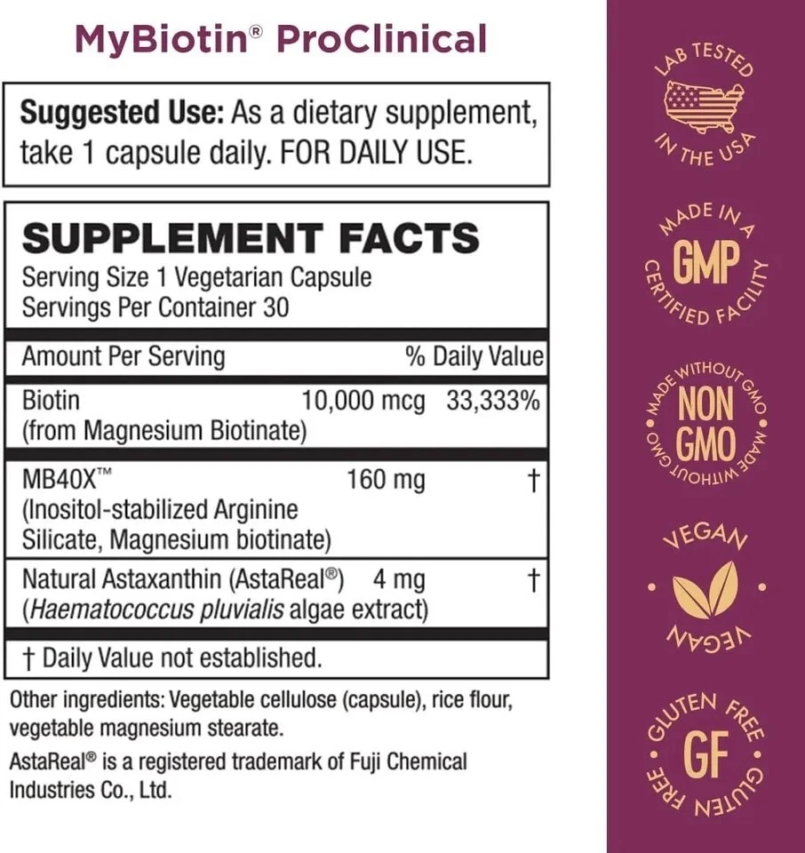 Thicker Hair... Smoother Skin… Welcome to The MyBiotin ProClinical Breakthrough! FREE SHIPPING USA MyBiotin ProClinical blazes a new trail in hair, skin, and nail beauty boosting formulas thanks to MB40X — a unique biotin matrix that is 40X more soluble than ordinary biotin. Plus, we added the antioxidant power of Astaxanthin to take the benefits to the next level! Clinical studies on the active ingredients in MyBiotin ProClinical show that this amazing formula can: Increased hair growth and hair thickness in as few as 3 weeks * Deliver up to 20% thicker hair by week 12* Reduced facial wrinkle depth * Improved skin texture * Improved skin hydration*