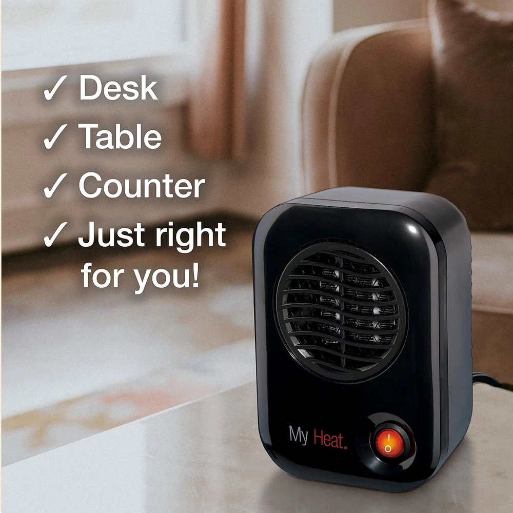 Plastic Imported ✅【KEEPS YOU WARM AT WORK】At 200-Watts and 682 BTUs, this low wattage mini space heater is ideal for use under the desk to keep your feet and legs warm. Best of all, because it’s low wattage, it won’t keep tripping the office circuit breaker every time you turn it on ✅【YOUR PERSONAL SPACE HEATER】At 6 inches tall with a 4” x 4” footprint, this cute, small electric heater takes up minimal desktop space and is intended to heat up your immediate space at home or the office. Designed to warm you, not a room. For that, we recommend getting a Lasko 1500-Watt tower heater ✅【EASY TO USE】No assembly required. Simply take it out of the box and plug it in to a standard 120v wall outlet. This energy-efficient, indoor ceramic heater draws about 2 amps and turns on with a flip of a switch. Compact and portable, MyHeat comes with a 6-foot cord and a 2-pronged plug. It’s also easily stored when not in use ✅【YEAR ROUND USE】Tired of always being cold at work in the winter? Is your cube right under the AC vent in the summer? If this sounds familiar, then this little heater is just what you need to keep you comfortable year-round. Produces a quiet, white noise that won’t disrupt your co-workers. MyHeat is available in 4 fun colors (black, white, blue, and purple) and makes for a great gift ✅【TRUSTED FOR GENERATIONS】Lasko has been making quality products for over 100 years. MyHeat is ETL Listed and comes with Automatic Overheat Protection. The on/off switch lights up to let you know the unit is on. The self-regulating, safe ceramic heating element keeps the exterior cool to the touch – taking the worry out of using the heater for long periods of time Product Description Save smart and spot heat where you need it with the My Heat Concentrated Personal Warmth Heater. This personal-use ceramic heater is perfect for those chilly days in your home or at the office. It will warm your personal space and save on overall heating costs using only 200-Watt. With built-in safety features, the MyHeat Heater is a must for your desk, dorm room, bedroom and more. This Lasko personal heater features simple manual controls and comes fully assembled. The ceramic heating element heats up quickly, and the built-in fan quietly distributes the warm air. Comes with a 3-year limited warranty Brand Story By