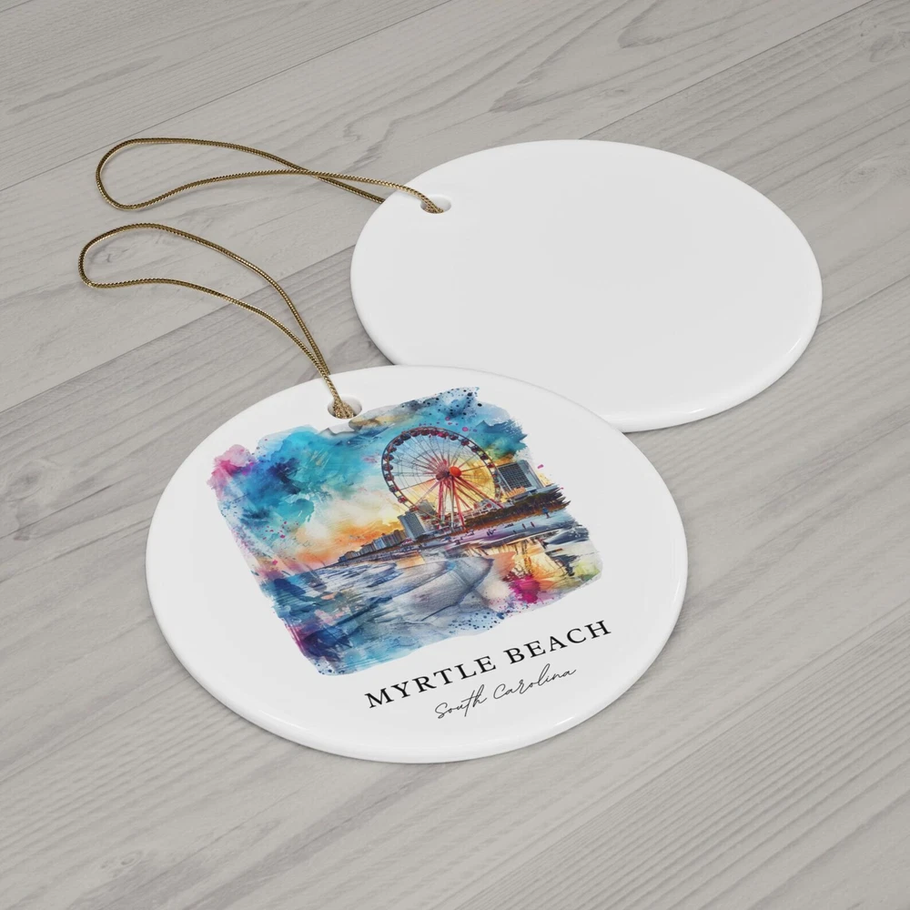 Myrtle Beach Sc Ornament Unique Myrtle Beach Souvenir Myrtle Beach Xmas Decor And Authentic Myrtle Beach Christmas Gift Material: Ceramic Color: White Shapes: Circle, star, heart and oval Can be printed on both sides Imprint full-color artwork, photos, or logos Hole for hanging string and hanging string included Printed in the USA