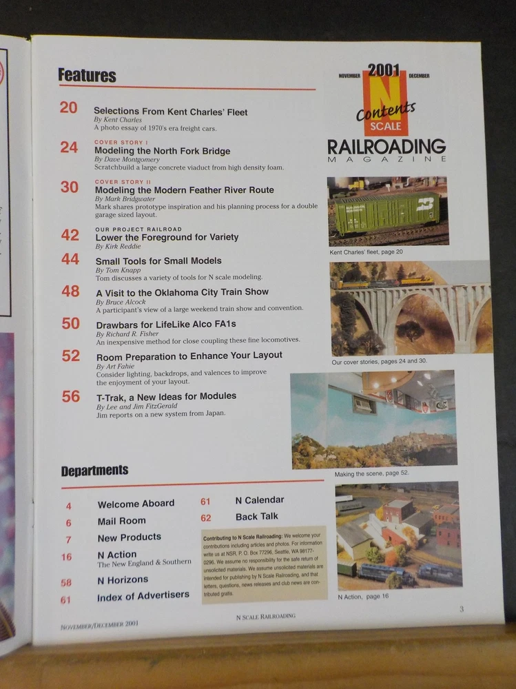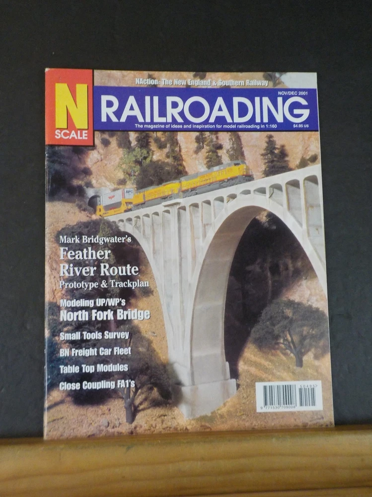 RailroadTreasures offers the following item: N Scale Railroading 2001 November December BN Freight Car Fleet North Fork Bridg N Scale Railroading 2001 Nov Dec BN Freight Car Fleet Selections From Kent Charles' Fleet By Kent Charles A photo essay of 1970's era freight cars. COVER STORY I Modeling the North Fork Bridge By Dave Montgomery Scratchbuild a large concrete viaduct from high density foam. COVER STORY II Modeling the Modern Feather River Route By Mark Bridgwater Mark shares prototype inspiration and his planning process for a double garage sized layout. OUR PROJECT RAILROAD Lower the Foreground for Variety By Kirk Reddie Small Tools for Small Models By Tom Knapp Tom discusses a variety of tools for N scale modeling. A Visit to the Oklahoma City Train Show By Bruce Alcock A participant's view of a large weekend train show and convention. Drawbars for LifeLike Alco FA1 s By Richard R. Fisher An inexpensive method for close coupling these fine locomotives. Room Preparation to Enhance Your Layout By Art Fuhie Consider lighting, backdrops, and valences to improve the enjoyment of your layout. T-Trak, a New Ideas for Modules By Lee and Jim FitzGerald Jim reports on a new system from Japan. All pictures are of the actual item. There may be reflection from the lights in some photos. We try to take photos of any damage. If this is a railroad item, this material is obsolete and no longer in use by the railroad. Please email with questions. Publishers of Train Shed Cyclopedias and Stephans Railroad Directories. Large inventory of railroad books and magazines. Thank you for buying from us. Shipping charges US Shipments: When you add multiple items to your cart, the reduced shipping charges will automatically be calculated. For direct postage rates to other countries, send me an email. Shipping varies by weight. Terms and conditions All sales are final. Returns accepted if item is not as described. Contact us before making a return. No warranty is stated or implied. Please e-mail us with any questions before bidding or buying. Thanks for looking at our items.
