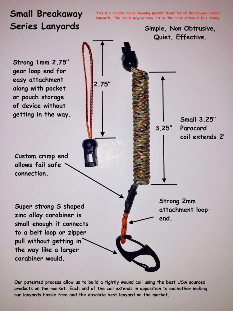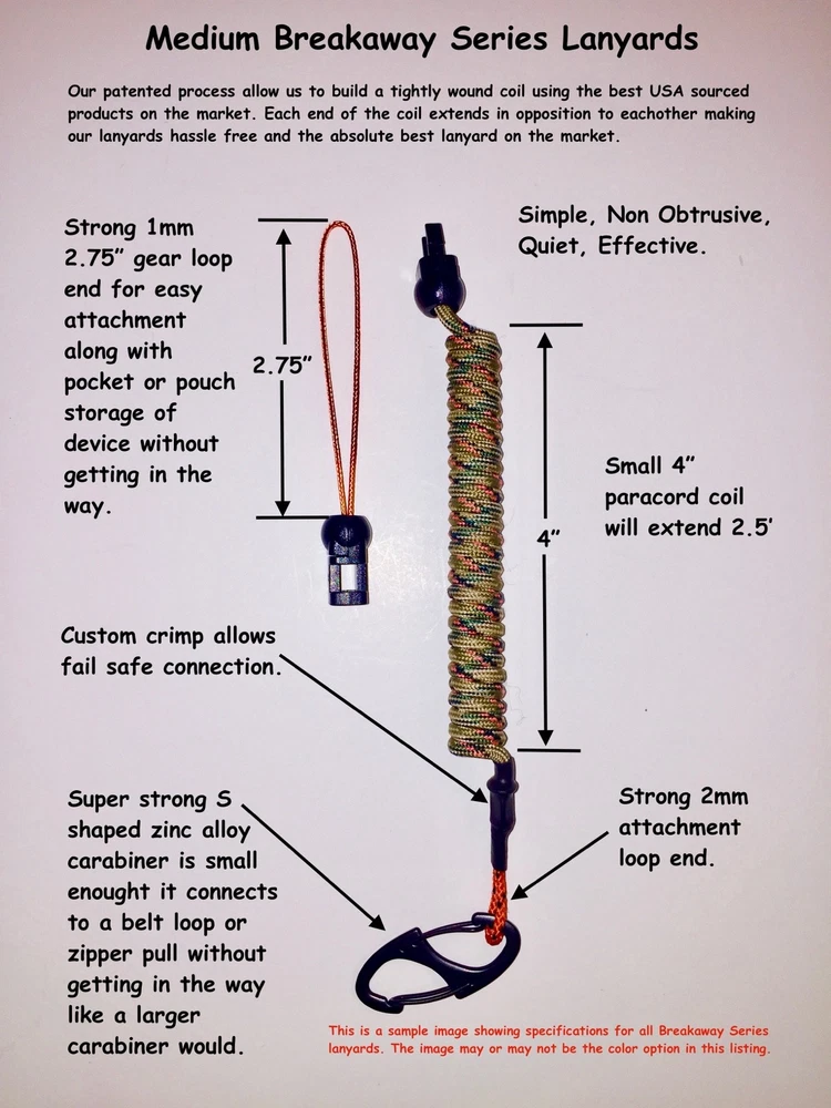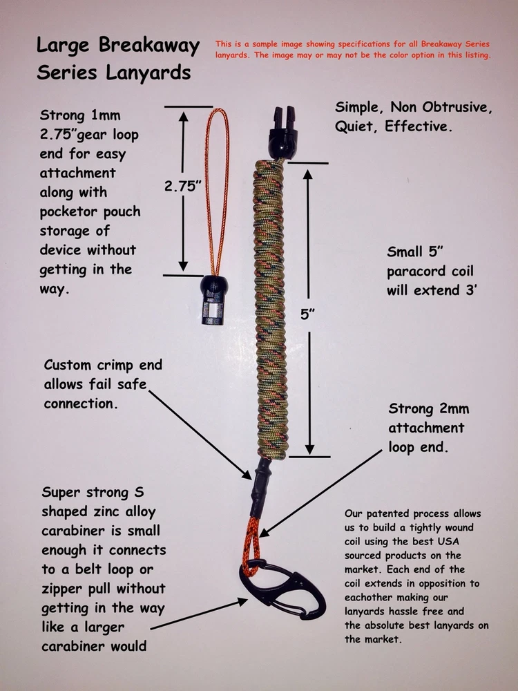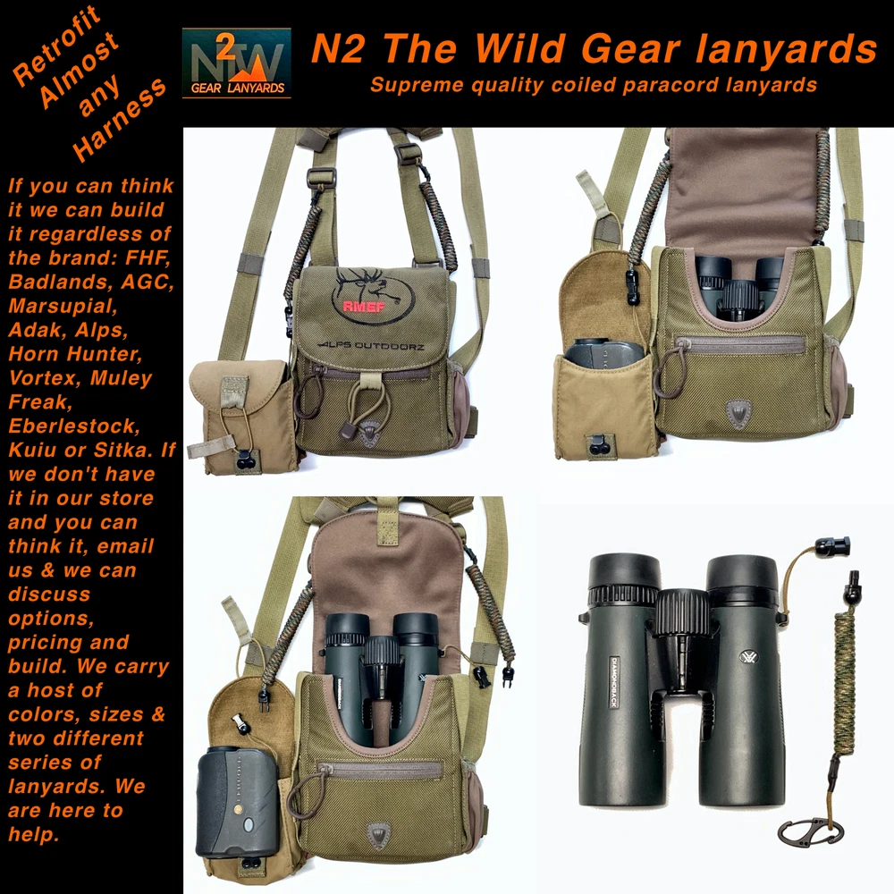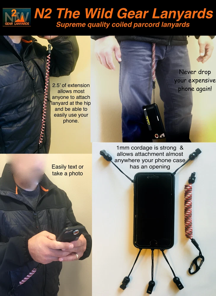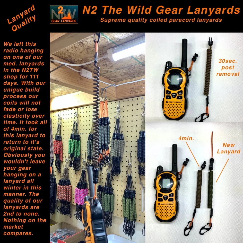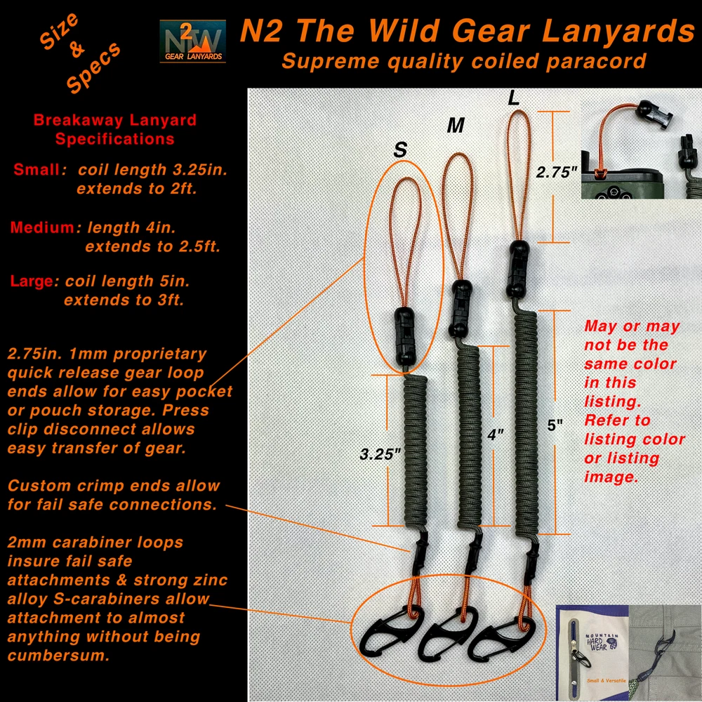 N2 THE WILD GEAR LANYARDS Don't forget your friends & family. Trust Your Gear 2 Nothing Less. Don't Just Secure It! Made in the U S A. Nothing Compares! This Listing Is For: Breakaway Series Lanyards "Our most versatile & best selling lanyards" 1mm, 2.75" gear loop end attaches to most small cameras, phone cases, range finders. The disconnect gear end allows the ease of moving your gear (GPS, Phone, Binos, Radios) back and forth from auto & ATV to your pack or pouch. It also allows you to easily share your items like binoculars with a friend. This is our most versatile lanyard. Listing Color : Black & Black Loop Ends Size: Small, Med, Large (see size description in drop down menu or in the photo section.) Press clip disconnect allows gear to be released from lanyard and is ideal for those items like a cell phone or GPS that need to move from hip to dash mount or charger making this lanyard versatile. Strong Zinc Alloy S shaped wire gate carabiner (Zinc alloy is stronger than aluminum and plastic, has tighter casting tolerances and withstands impacts better than plastic, cast iron or aluminum). Ultra quiet, compact, non obtrusive. Initially built for hunting applications with no metal on metal rings, clamps or cheap Chinese keychain ends to rattle around. Simple, quiet, effective & ultra secure. Our proprietary tooling and custom build process has allowed us to build a strong, light, small, tightly wound, quiet lanyard with apposing ends for hassle free use. We use only the best quality USA sourced materials. Don't be fooled...These are no Chinese keychains! Check our other listings for exclusive color size and series options . We are a small direct to consumer business. Don't wait till the busy Hunting & Fishing months approach. We build in batches so get your colors and size options while supplies last. If you have any questions about which lanyard (size, color or style) please don't hesitate to contact us. N2 THE WILD GEAR LANYARDS. THE STORY N 2 The Wild Gear Lanyards was established 2 fill a void: 2 provide a supreme quality lanyard solution 2 the outdoor community. In my own personal quest throughout 40+ years of outdoor experiences I have lost enough gear, have tried just about every possible makeshift solution 2 secure basic items such as radios, GPS's, compass, range finders, water bottles, binos & more with no real perfect solution. I don't know if there is a perfect solution but it's what drives me as an avid hunter & outdoorsman 2 create a supreme quality option for what I consider a necessity. Backpacking, hiking, hunting, military, camping, ATV riding, fishing, snowboarding and rock climbing have all been a part of my life over the past 40+ years. Living in the northwest has spoiled me and allowed me a test bed for what really works. Many times it's the most ordinary products that make the biggest impact on our daily lives. At N2 The Wild Gear Lanyards we believe that by offering the best of the best in even the simplest products, focus on quality over quantity and bring a direct to consumer business model to keep pricing down we can make a big difference in the lives of our customers. Whether you are an avid hunter & outdoorsman like myself, military, first responder or need a solution for your every day life, work, job site or play I think you will find a gear lanyard from N2 The Wild Gear Lanyards that will fit your needs. Our goal here at N2 The Wild Gear Lanyards is to bring a unique, direct to consumer product to the customer at a humble price point. No big box stores or middle man/3rd party mark up. We are a rare & unique 100% hands on manufacturing, testing, shipping, customer service & quality control company. est. 2018 View more great items