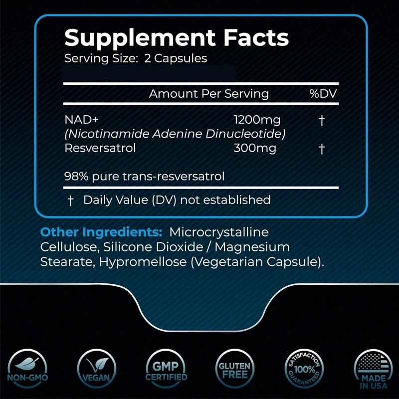 Use NAD+capsules to release the potential of cells. High quality formula, each containing 1500 milligrams of NAD+dose, provides necessary support for your cellular and overall health. 90 pills per bottle, effective supplement for 45 days NAD+is an important coenzyme involved in many biological processes, including DNA repair, energy production, and cellular metabolism. As age increases, NAD+levels naturally decrease, leading to decreased energy, cognitive function, and overall vitality. These NAD+capsules are designed to help increase NAD+levels, help combat fatigue, contribute to healthy aging, and support optimized cell function. : Two capsules per day can help you experience the benefits of enhancing energy, improving cognitive function, and youthful vitality. Experience the differences, as this scientifically supported formula can rejuvenate your cells, support DNA repair, and promote healthy metabolism. Rediscovering the energy and mental clarity that thrive in your daily life Discover the transformative potential of NAD+, seize the opportunity, and unleash the true vitality of your body. Don't wait - order now and start living a life full of energy, resilience, and happiness