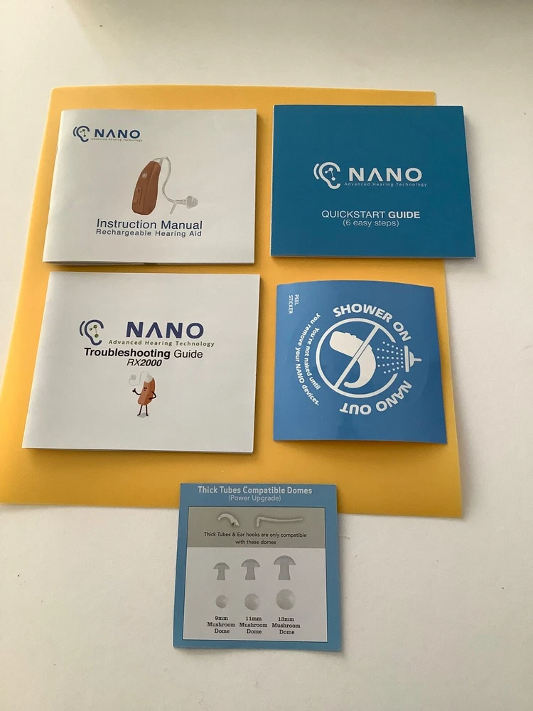 Sound Processing:DigitalItems Included:Hearing Aid Case, Hearing Aid Dome, Pre-Formed Sound Tubes Left & Right, Cleaning Brush, Cleaning WireManufacturer Warranty:3 MonthsHearing Aid Fitting:Behind the Ear (BTE)Color:BeigePower Source:Rechargeable BatteryCustom Bundle:NoModel:RX2000Labels & Certifications:CE CertificateDepartment:AdultType:Hearing AidExpiration Date:NABrand:Nanogtin13:Does not applyFeatures:RechargeableTo Fit:Both EarsCountry/Region of Manufacture:SwitzerlandMPN:P1133RX2000UPC:Does not applyNumber of Settings:2
