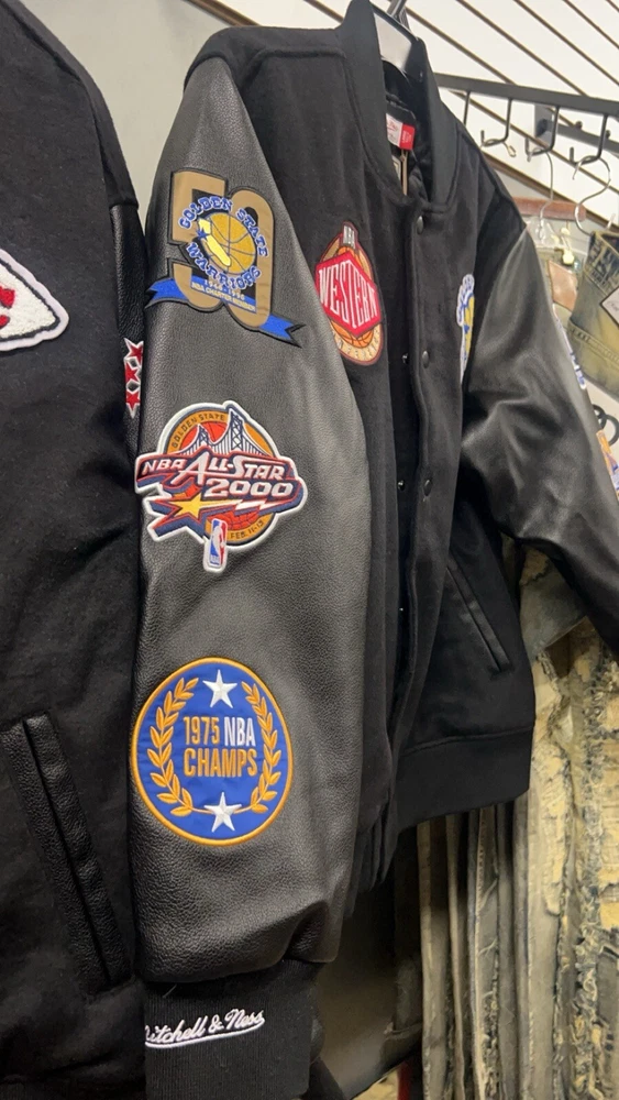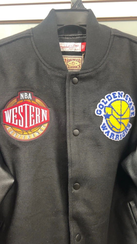 Show your Golden State Warriors pride with this officially licensed Mitchell & Ness varsity blackout jacket. Perfect for any NBA fan, this jacket features the team's iconic logo and colors in bold black. Made for men in size large, it's a must-have for any basketball enthusiast. Whether you're heading to the game or just want to show off your team spirit, this jacket is the perfect choice. Celebrate the Golden State Warriors and their victory in the NBA Finals with this stylish and comfortable jacket. Get yours today!