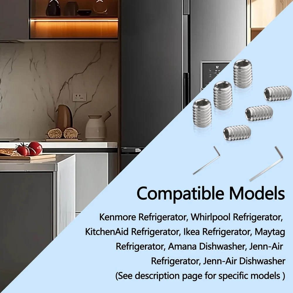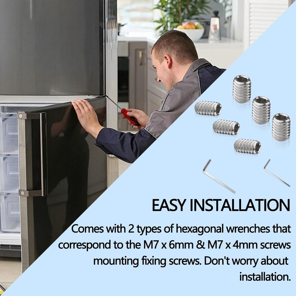NBPLUS W11366418 Refrigerator Freezer Door Handle Mounting Set wrench, Screw Product Details Material: Stainless Steel Brand: NBPLUS Color: Screw Product Dimensions: 0.3"L x 0.25"W Exterior Finish: Stainless Steel Special Feature: Corrosion resistant Included Components: Screw Metal Type: Stainless Steel Handle Material: Stainless Steel Number of Items: 8 Manufacturer: NBPLUS Item Weight: 0.317 ounces Item model number: Parts-Z-47-s Size: wrench Finish: Polished Item Package Quantity: 1 Number Of Pieces: 3 Special Features: Corrosion resistant Batteries Included?: No Batteries Required?: No Material: Stainless Steel Brand: NBPLUS Color: Screw Product Dimensions: 0.3"L x 0.25"W Exterior Finish: Stainless Steel StyleHandle Type: Modernno ShapeFinish Type: CylindricalPolished 【Wide Application】Newly upgraded set screws for most refrigerator handle mounting. Applicable to refrigerators for Kenmore, Whirlpool, KitchenAid, Ikea, Maytag, Jenn-Air, and dishwashers for Amana, Jenn-Air. Replacement part numbers: W11366418, PD00059403, AP6888139, WPW10010140, PS12723933, W10114271, W10664010, W10010140, W10223573 【Product Specification】The W11366418 refrigerator freezer door handle mounting set screw contains TWO Tiny Screw Sizes: M7 x 6mm and M7 x 4mm. Thread length: 7mm / 0.3 inches. Thread diameters: 6mm / 0.25" and 4mm / 0.19" 【High-Quality Material】The latest upgraded refrigerator door handle installation screws are made of stainless steel, strong hardness,corrosion-resistant, deep thread, firm and non-slip. 【Easy to Install】Refrigerator handle screws can be well hidden, ideal for narrow areas that require the head to be flush with or below the surface without detracting from the aesthetics of the components. You can effortlessly install and tighten the refrigerator or freezer door handles using a hex wrench. The operation is straightforward and clear at a glance.