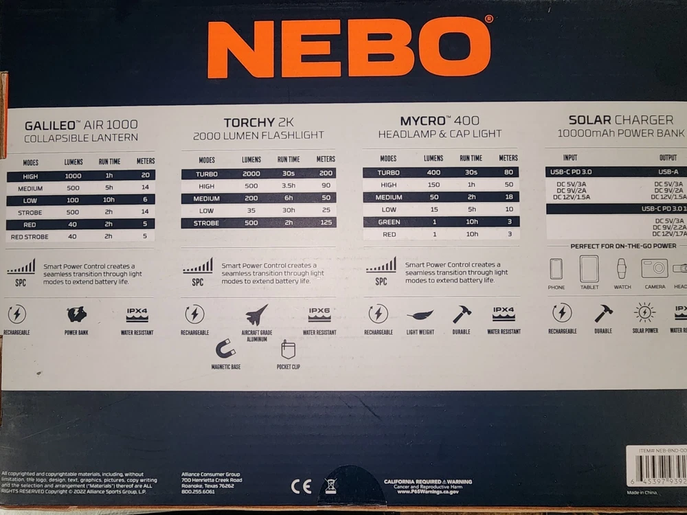 The NEBO Emergency Kit is a versatile unit combining flashlight, headlamp, lantern, and solar battery bank functionalities. It offers a range of 400 to 2000 lumens with three LED lights. Features include magnetic base, waterproof design, rechargeable batteries, wrist strap, and solar power source. The product is in gray color and includes a warning for California Prop 65.