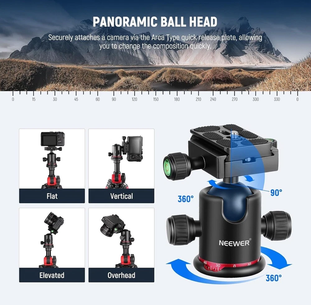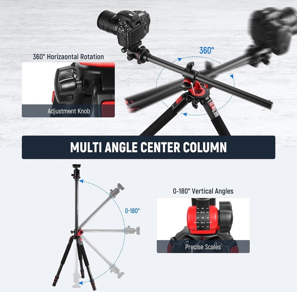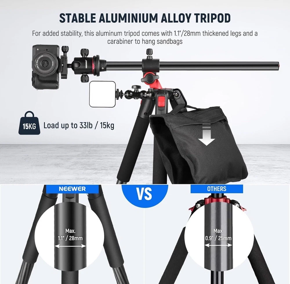 Lot #27 NEEWER 79 inch Camera Tripod Monopod with Center Column and Ball Head Aluminum, Arca Type QR Plate, Bag, Horizontal Tripod Overhead Camera Mount for DSLR Camera, Video Camcorder, Max Load: 33lb Condition: Open Box/New Brand: Neewer Color: Black Compatible Devices: Camera Material: Aluminum, Metal, Magnesium Item Weight: 113.17 Ounces - UPGRADED DESIGN: The central column can be used vertically (at 0 /22.5 /45 /67.5 /90 Degree) or horizontally (360 Degree rotation) so that photographers can easier realize panoramic,low angle and macro shooting; 4 section legs with quick release twist locks allow you to adjust the working height from 26.4" to 78.7"/67cm to 200cm in seconds; Note: The calibration line must be aligned to be locked or the column can not be stable - PRACTICAL AND ADJUSTABLE: Max.28 millimeter large diameter magnesium aluminium alloy tubes with load capacity up to 33lbs/15Kg;The tripod can be folded to 26.4"/ 67cm compact size and 5.7 pounds/ 2.6 kilogram net weight for easy carrying with bag; 3 position leg angle adjustment can help you take photos flexible for different scenarios and photography conditions - TRANSFORM INTO MONOPOD: One of the tripod leg tube can be quickly disassembled and connect with the central column to transform into a monopod, providing an alternative way of shooting; The height of the monopod is adjustable from 21.7" to 61"/ 55cm to 155cm. Compatible with Sony Canon Nikon and other DSLR cameras, and camcorders. - 360 DEGREES PANORAMA BALL HEAD: The specially designed 36 millimeter metal ball head can rotate 360 degrees which will allow you to get the perfect shooting angle to create panoramic photography. It has 2 independent control knobs to facilitate the adjustment of each precise angle - PRECISE AND FLEXIBLE: The bubble level indicator helps to achieve accurate horizontal alignment and provide photographic stability. Comes with a hook which can hang sandbag or other heavy duty objects to increase the stability for photography and videography; 3/8 inch screw hole under the bubble level allow you to use more photographic equipment such as magic arm, monitor and LED lights. Compatible with Arca type plate for quite release