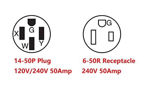 NEMA 14-50P to 6-50R Compact 240V 50 Amp 4 Prong Male Plug to 3 Prong Female Power Cord Adapter 240V 50 Amp, cannot transform to 120V As it is used for 50A current, it is normal for the product to be a little tight 14-50P Ground connects 6-50R Ground 14-50P Hots connect 6-50R Hots 14-50P Neutral is empty(Open) 240V is main voltage, 250V is voltage