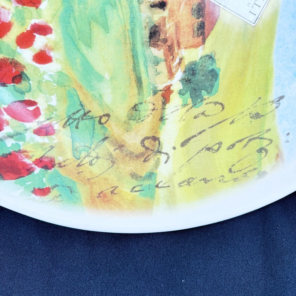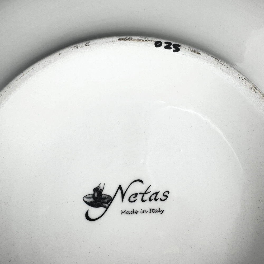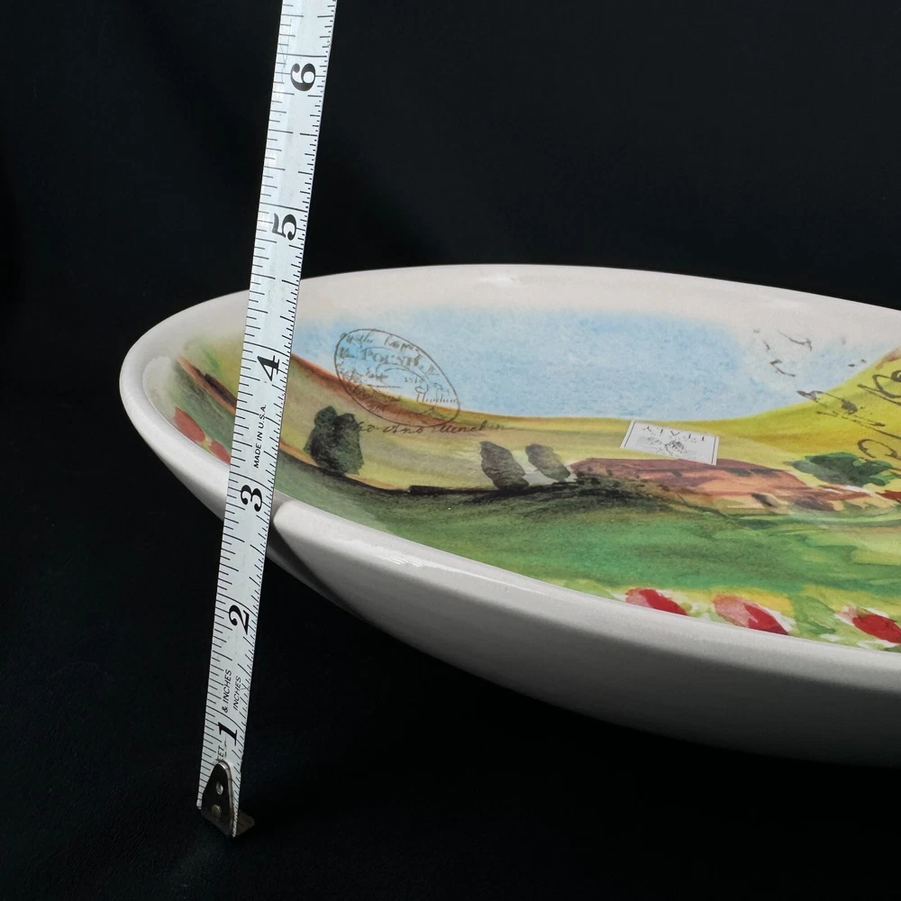 Netas large salad/serving bowl with hand painted Tuscany Italy countryside scene with red flowers and writing embellishments. Can't tell if the writing is the designer's signature. It is 14 1/2" diameter and stands 2 3/4" high. Excellent condition with no cracks, chips or crazing. Still has the original label "Made in Italy". There are a few small white specks that are bumps in the glaze and are not chips, as shown in the close-up photos. Please view the photos for details and condition. Measurements and photo colors are approximate. Shipping is USPS Ground Advantage at the rate determined by eBay. Follow your item's delivery progress with the USPS website Tracking Tool. Terms of Sale: Photos are of the actual item you will receive and sold "as is". Placing an order is your agreement that you know what you are buying, have viewed the photos and find the condition acceptable. Use eBay Messages to contact me for questions or concerns about your order. Please inspect your items upon arrival and contact me if there are any problems. Free returns within 30 days after delivery.