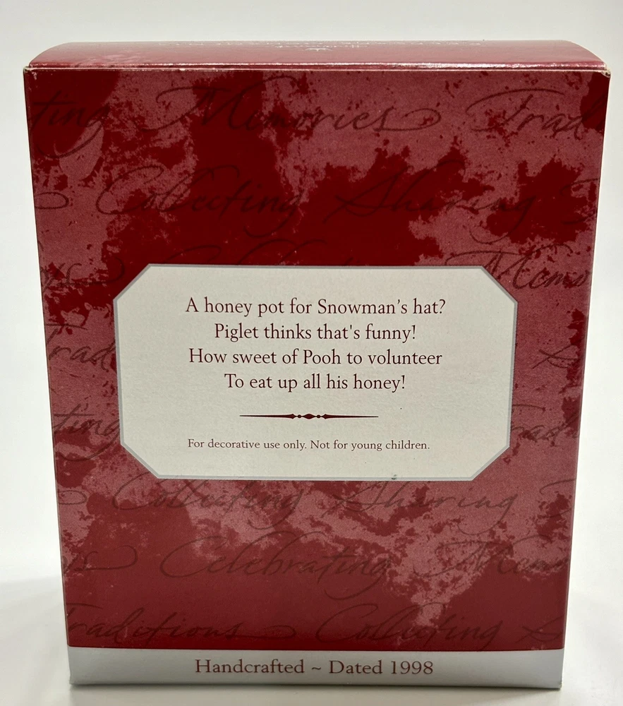 Theme:HolidayUPC:015012457766Subject:BuildingShape:SnowmanOccasion:ChristmasYear Manufactured:1998Brand:HallmarkCharacter:Piglet, Winnie the PoohCollection:OrnamentsFranchise:Winnie the Poohgtin13:015012457766Type:Ornament