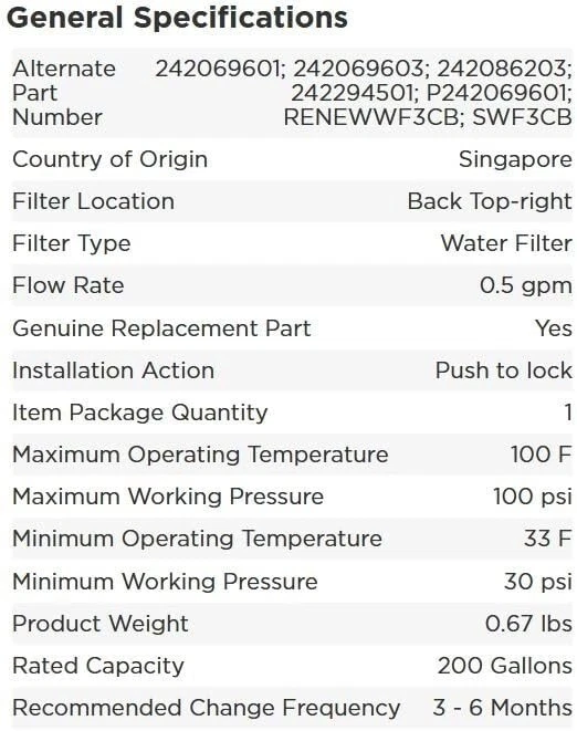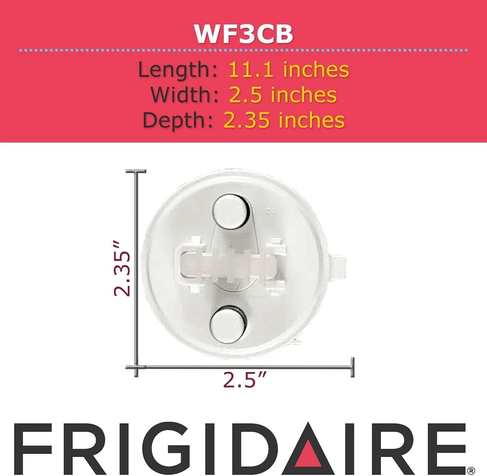 2PCS For Frigdaire WF3CB Pure Source 3 Refrigerator Water Filter (US STOCK) Descriptions 1.Quick installation and easy replacement: installing this filter is very easy. Just aim in the right direction. 2.Compatible Models:Compatible with Pure source3,WF3CB 3.KINDLY REMINDER: Please drain about 4 gallons of water first to maximize the efficiency of the filter. Please replace the ilter every 6 months or 200 gallons to minimize impurities. 4.Easy to Install - No special tools required. Just insert water line into built-in plugs eliminating the risk of leaks. 5.Packaging upgrades. Operating Parameters Flow rate: 0.66 GPM Capacity: 6 month / 200gallons PRESSURE: 30-125PSI (207-852kPa) Temperature: 1-38℃ (34-100°F) product life: 6 Months or 200 Gallons Installation Instruction 1.Shut off water source 2.Remove the existing product by turning i left,and then take it out 3.Remove the cap of a new product,insert it into and turn right to lock it in place 4.Recover the water source,and check it there is leakage 5.Run the working process for 4 minutes(about 8 cups of water )for purge 6.Reset replacement indicator light by pressing the ICE TYPE button and the CHILD LOCK(or MOISTURE CONTROL)button simultaneously for 3 seconds Package: 1 X Water Filter