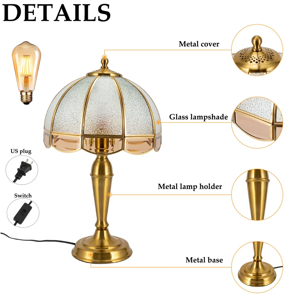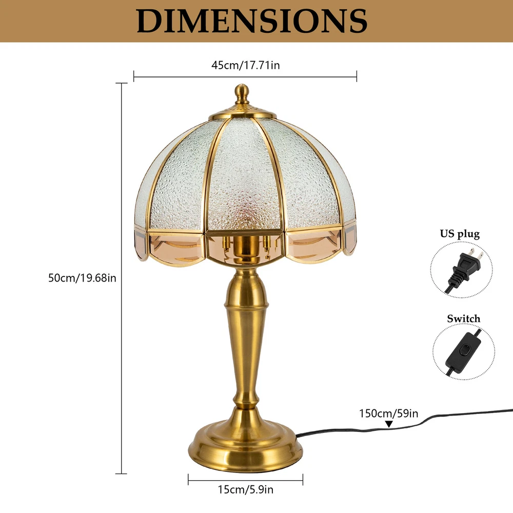 Specifications Material: Iron and Copper Model: JX-011 Style: Modern Color: Gold Lamp Type: Table Lamp Process: Electroplating Assembly Required: Yes Mount Type: Tabletop Indoor/Outdoor Usage: Indoor Use Only Power Source: Corded Electric Plug Type: US Standard Control Method: Push Button Efficiency: E Voltage: 110V Light Source: 1* E26 Bulb(Not Included) Max. Bulb Power: 40W Applicable Area: 5-8m²/53.8-86.11ft² Lamp Base Diameter: 15/5.9in Lampshade Diameter: 45cm/17.71in Lamp Height: 50cm/19.68in Power Cord Length: 1.5m/4.72ft Package Included 1* Table Lamp NEW 40W Gold Table Lamp Indoor Reading Light Table Lamps 110V for Small Space Description With its beautiful and elegant design, this table lamp is a godsend for adding a sense of art and sophistication to your space. Its thoughtful switch design allows you to easily control the light and darkness as if playing a game of light and shadow. If you're scratching your head over home décor or creating ambient lighting, then this lamp is the ideal partner to light up your life and instantly elevate your home's style. Key Features Build to Last: Our product is made of high-quality iron and copper and adopts an electroplated treatment, so it is resistant to deformation, oxidation, corrosion, and high temperatures, and has a long service life. Bedside Lighting Assistant: The round lampshade of 17.71 inches in diameter and E26 light source (not included) help emanate a suitable radiance within 53.8-86.11ft², so you can enjoy a relaxing bedtime reading. Modern Decoration: Fusing the aesthetics of contemporary art and the spirituality of design, this table lamp is a work of art with clean lines and simple style. It can fit into most home decoration styles and create an enjoyable visual experience. High Stability: The lamp base (5.9" in diameter) with an anti-slip mat improves the stability of this product without easily shaking, so you can use it confidently. Easy to Use: You simply install the lampshade and bulb, insert the plug into the socket, and press the switch to turn it on, enjoying a peaceful bedtime. Easy to Clean: Thanks to the simple structure, detachable lampshade, and smooth surface, you can easily wipe it clean with a rag. Nice Gift: This practical and beautiful lamp is a great holiday or housewarming gift for family, friends, and lovers so that they can enjoy a more convenient life. Customer Service: We aim to provide quality products and services. If you have problems, please feel free to contact us. We will reply and solve the problem for you as soon as possible. Details Standard E26 Lamp Holder: It is suitable for incandescent, CFL, halogen, LED bulbs, and more and allows for easy replacement, making the whole room look brighter and more beautiful. Long Power Cord: The 4.72ft long power cord is designed for your convenience and increased safety of use. Application With a lighting area of 53.8-86.11ft² , it is suitable for lighting and decoration in bedrooms, dining rooms, study rooms, living rooms, balconies, cafes, hotels, etc., or on the bedside, end tables, working tables, and more. Specifications Material: Iron and Copper Model: JX-011 Style: Modern Color: Gold Lamp Type: Table Lamp Process: Electroplating Assembly Required: Yes Mount Type: Tabletop Indoor/Outdoor Usage: Indoor Use Only Power Source: Corded Electric Plug Type: US Standard Control Method: Push Button Efficiency: E Voltage: 110V Light Source: 1* E26 Bulb(Not Included) Max. Bulb Power: 40W Applicable Area: 5-8m²/ 53.8-86.11ft² Lamp Base Diameter: 15/5.9in Lampshade Diameter: 45cm/17.71in Lamp Height: 50cm/19.68in Power Cord Length: 1.5m/4.72ft Package Included 1* Table Lamp Notes Please prepare an E26 bulb yourself. Please make sure the power supply is disconnected before installation. Please do not touch the bulb or look directly at the lit bulb when the fixture is turned on, and keep flammable materials away from the table lamp. Please use the lamp within the applicable voltage range and clean the lamp regularly. Please cut off the power supply when you clean the light or replace the light bulb. We have added a protective oil to ensure that the lampshade remains shiny after long-term transportation and storage, upon receipt, please wipe off the excess oil with a dry cotton cloth(not included). Please allow the slight color difference caused by the shooting light and 1-3cm error due to manual measurement, and make sure you do not mind before ordering. Payment Delivery details Terms of sales About us Contact us Payment We accept ebay payment 。 Fees such as import duties, taxes are not included in the item price or shipping costs. These charges are the buyer's responsibility. Delivery details Shipping: 2-9 working days to: USA Terms of sales We maintain high standards of excellence and strive for hundred percent customer satisfaction. Feedback is very important to us. We hope that you contact us immediately before you give neutral or negative feedback, so that we can address your concerns. It is impossible to address issues if we do not know about them! About us Your satis faction is our ultimate goal. We work hard to earn your trust and future business. Our certified technicians have tested each item before shipping. The unit comes with 1 year limited warranty on all manufacturing defects. a) If you receive a defective item, you may return it or ask for a discount. Please contact us within 14 days after you receive the package. b) What you returned must be intact and in its original packaging as re? u. Customer is responsible for shipping costs of the returned item. c) We will cover the cost of shipping back t with the shipping rate indicated in the registration page. We will send you a new unit or refund the full payment you paid. Thank you. Contact us Business Hour Business Hour: Monday To Friday: 8:30 AM to 5:00 PM (Beijing China time) Due to time zones, our reply to your questions may not be immediately. But within above working time, we will re