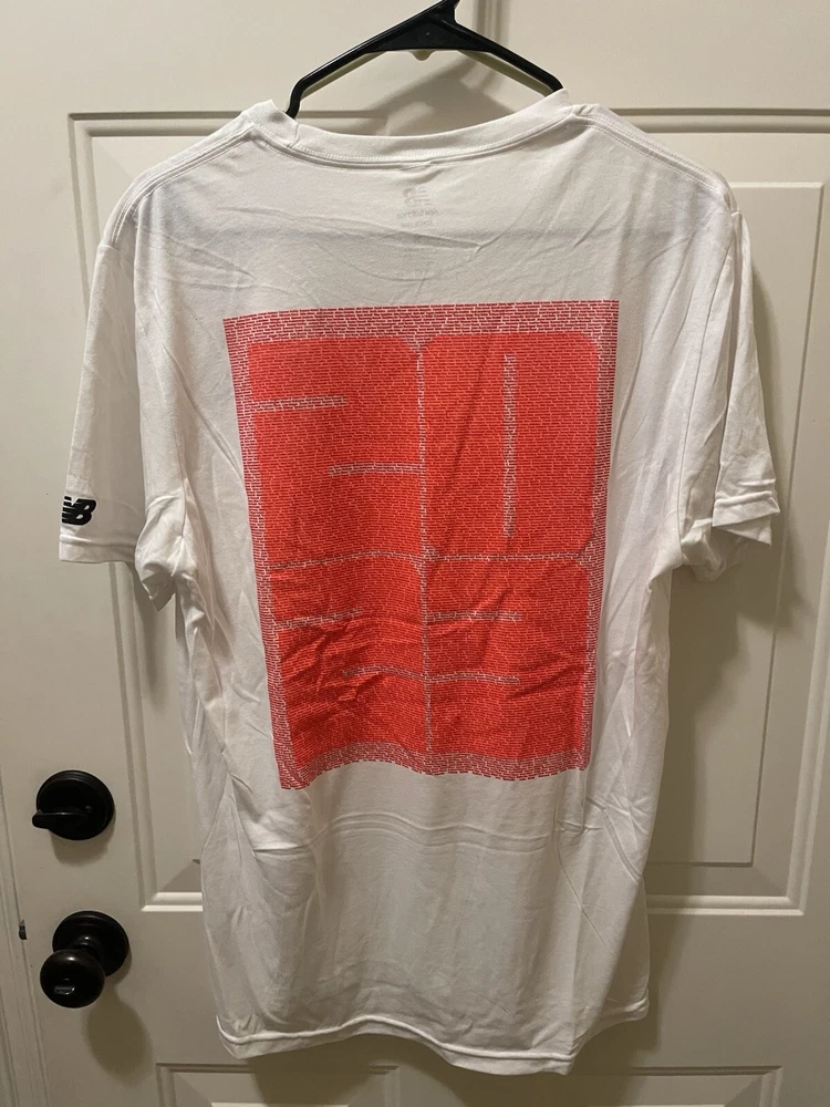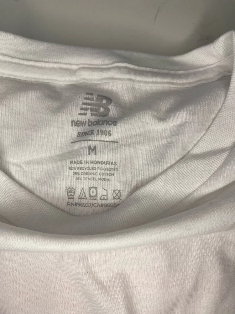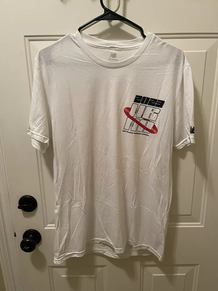 This New Balance Nationals Outdoor 2023 T-shirt in size Medium features a solid white color with a graphic print design, suitable for activewear occasions. The shirt has a crew neck and short sleeves, made from a blended fabric with a medium wash. The relaxed fit and regular size type cater to men, ideal for running and jogging activities in various seasons like winter, summer, fall, and spring. The shirt captures an outdoor theme and is perfect for those looking for a comfortable and stylish activewear option.