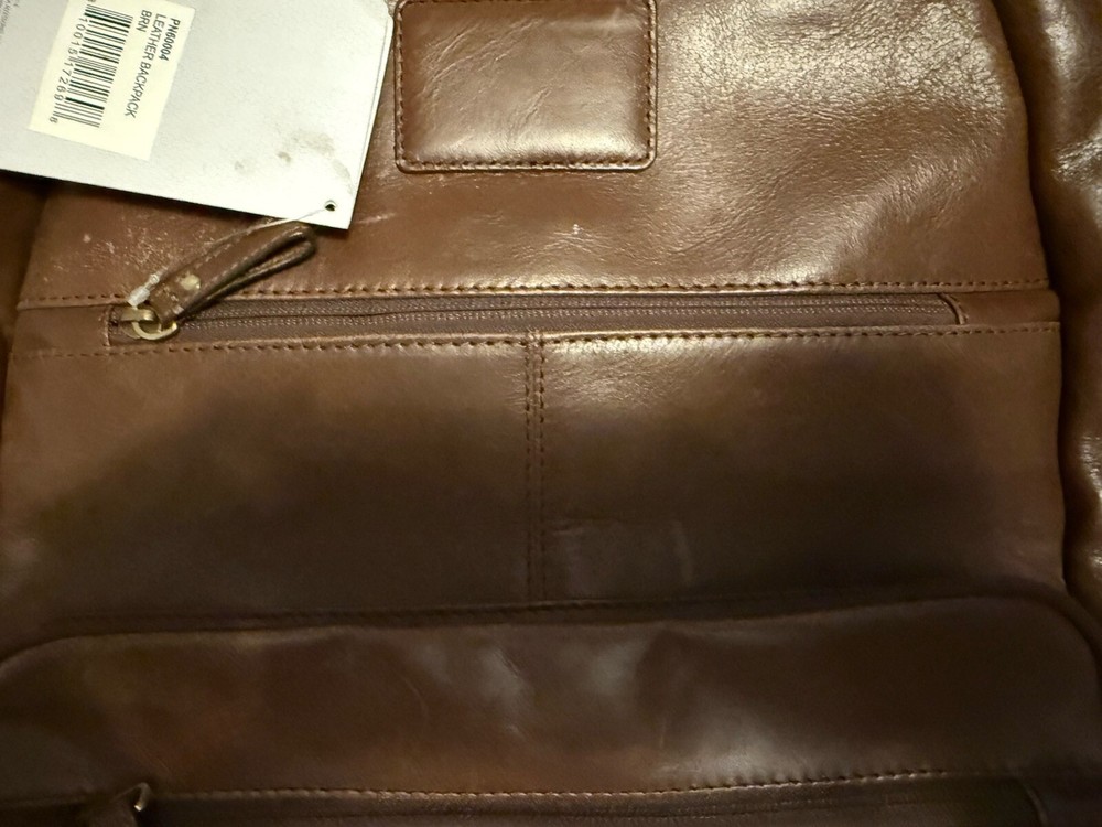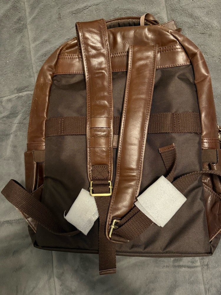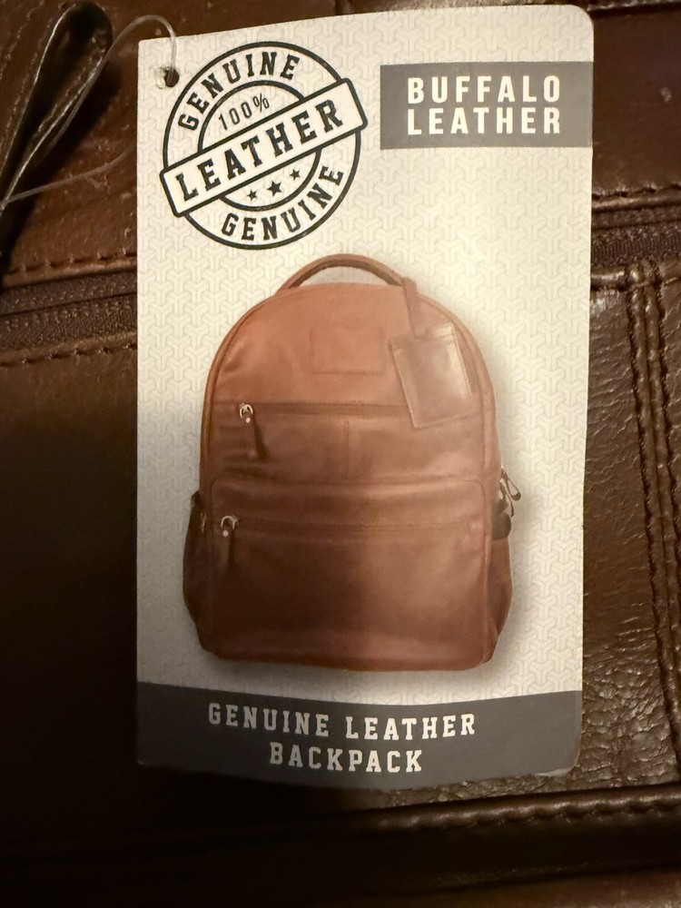 This large dark brown backpack is made of solid leather from the brand GENUINE BUFFALO LEATHER. It features a zip, buckle, and snap closure, with a fabric lining and leather handle/straps. The backpack has a size of 20 inches in height and 15 inches in depth, suitable for laptops with its dimensions of 16x10x7.5. It includes various inner and outer pockets, an adjustable strap, a bottle pocket, and insulation, making it ideal for school or everyday use. The product also comes with a Certificate of Authenticity, highlighting its quality and authenticity as part of the Rawlings product line.
