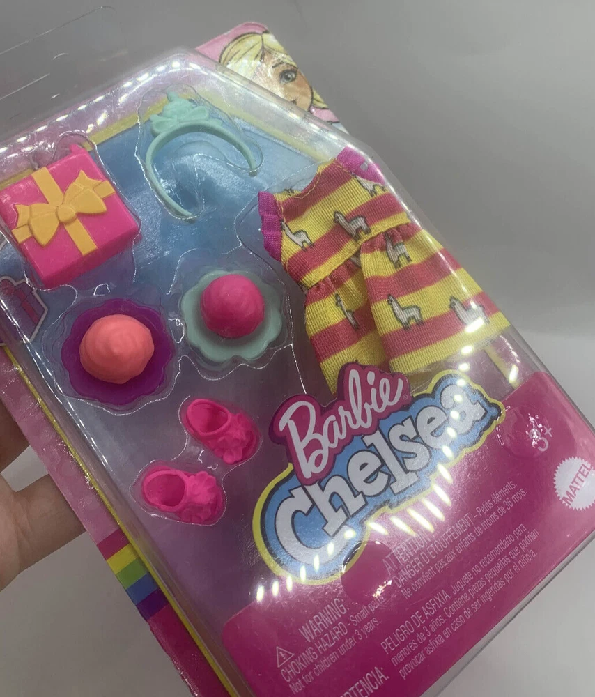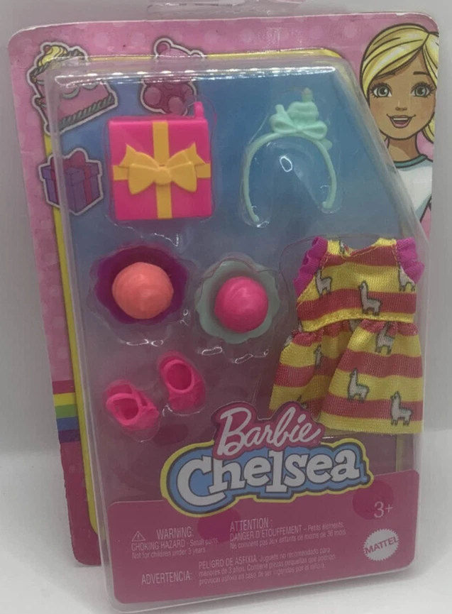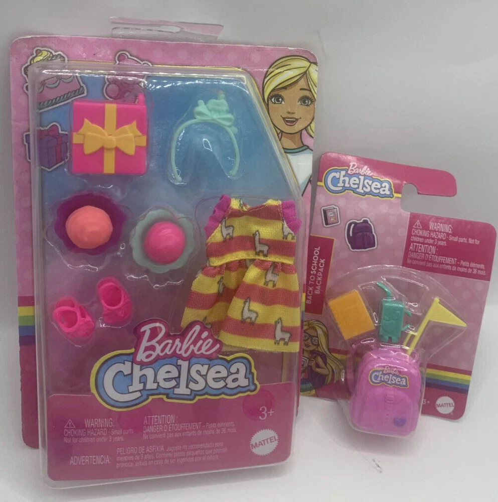 Lot of 2 packs Brand New in packaging Chelsea accessories. One is a Back to School backpack set and the other is an outfit. The outfit is a Birthday outfit with Alpacas on it. Pink backpack The packets are unopened and still sealed. Only minor scratches on the cardboard. Please see all photos. Nonsmoking home but we have pets.