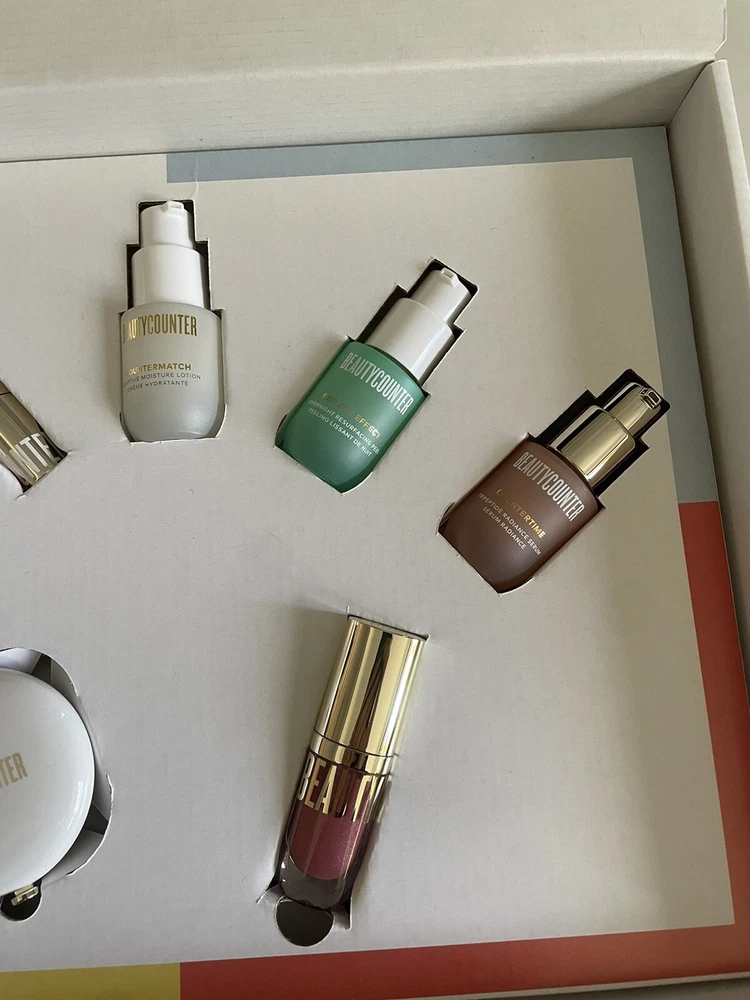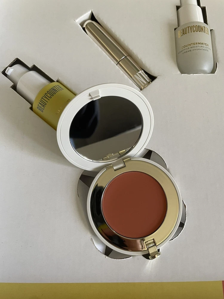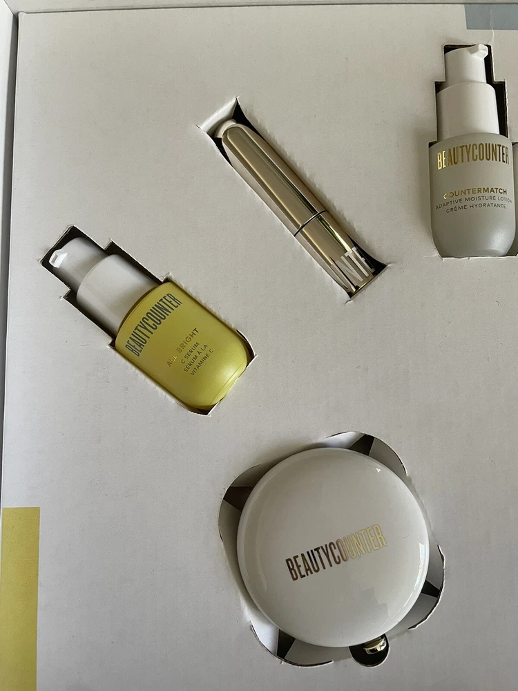 NEW Beautycounter Gift Set includes All Bright C Serum, overnight resurfacing peel, Adaptive moisturizer, tripeptide radiance serum mini beyond lipgloss, mini mascara, and a blush in color cheeky clean This is a limited edition collection. Please note the box is nothing fancy its just a regular cardboard packaging. Perfect for holidays