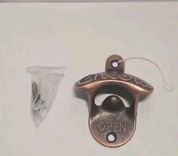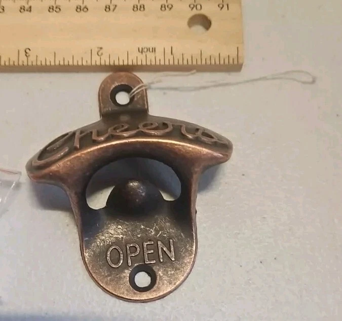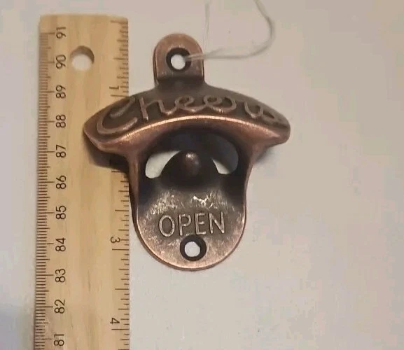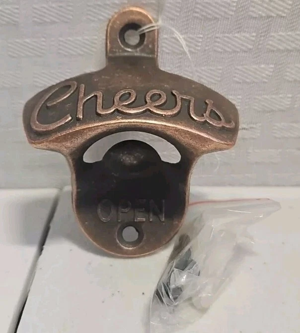 This wall-mounted bottle opener is the perfect addition to any breweriana collection. With a sleek copper design and hardware, it effortlessly opens all types of bottles. The opener is made in China and features the popular "CHEERS" design. Perfect for beer enthusiasts or collectors, this opener is a must-have. Add it to your collection today! Wall mounted with screws included.