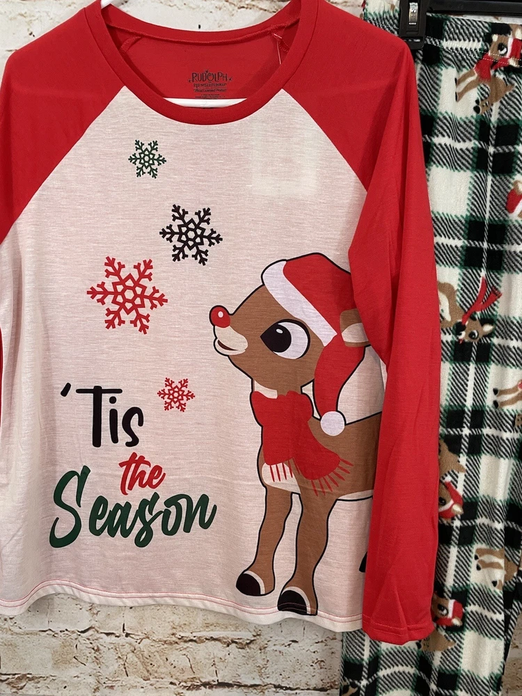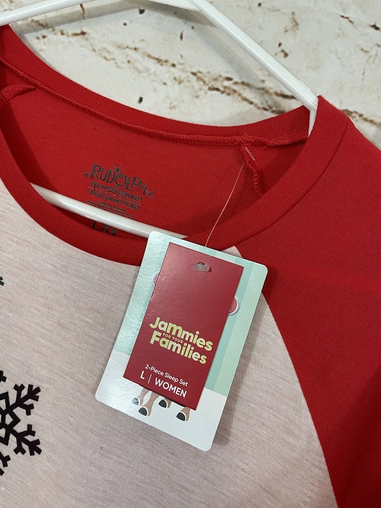 New with tags Jammies for Your Families Christmas Rudolph the Red Nosed reindeer womens Large two piece pajamas set Includes the long sleeved popover sleep top with Rudolph graphic and the and the elastic waist pull on fleece sleep pants , 100% polyester, clarice and multi plaid *Measurements *Top *Underarm to Underarm 21.5 inches *Length 26 inches *Pants: *Waist:16.5 inches unstretched ( elastic waist) to 20.5" stretched **Inseam 30 inches