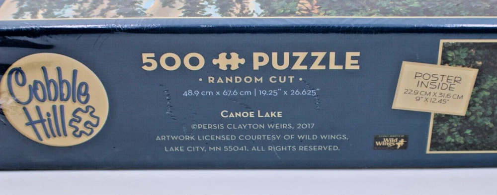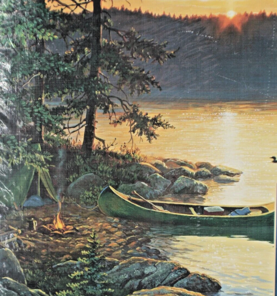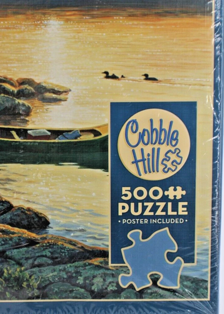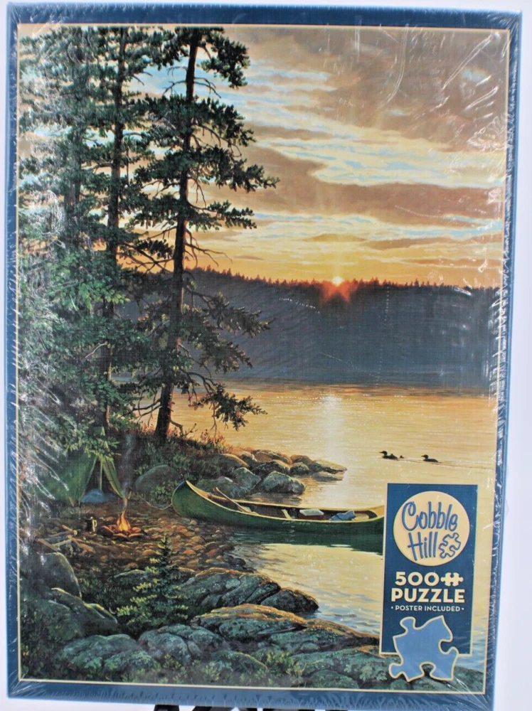 This 500-piece puzzle titled "Canoe Lake" by Persis Clayton Weirs is a perfect addition to your puzzle collection. The puzzle features a beautiful lakeside camping scene with loons and a canoe. It is made of high-quality cardboard and has interlocking pieces for easy assembly. A poster is also included to help with the puzzle-solving process. The recommended age range for this puzzle is 8 years and up. The puzzle is complete, factory sealed and has never been worked on, making it a great gift for those who love the outdoors. FREE SHIPPING Completed Size: 19.25" x 26.625" See photos for details