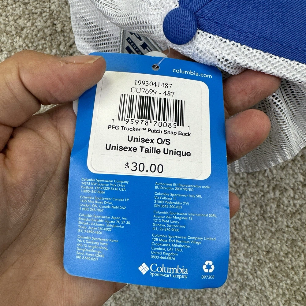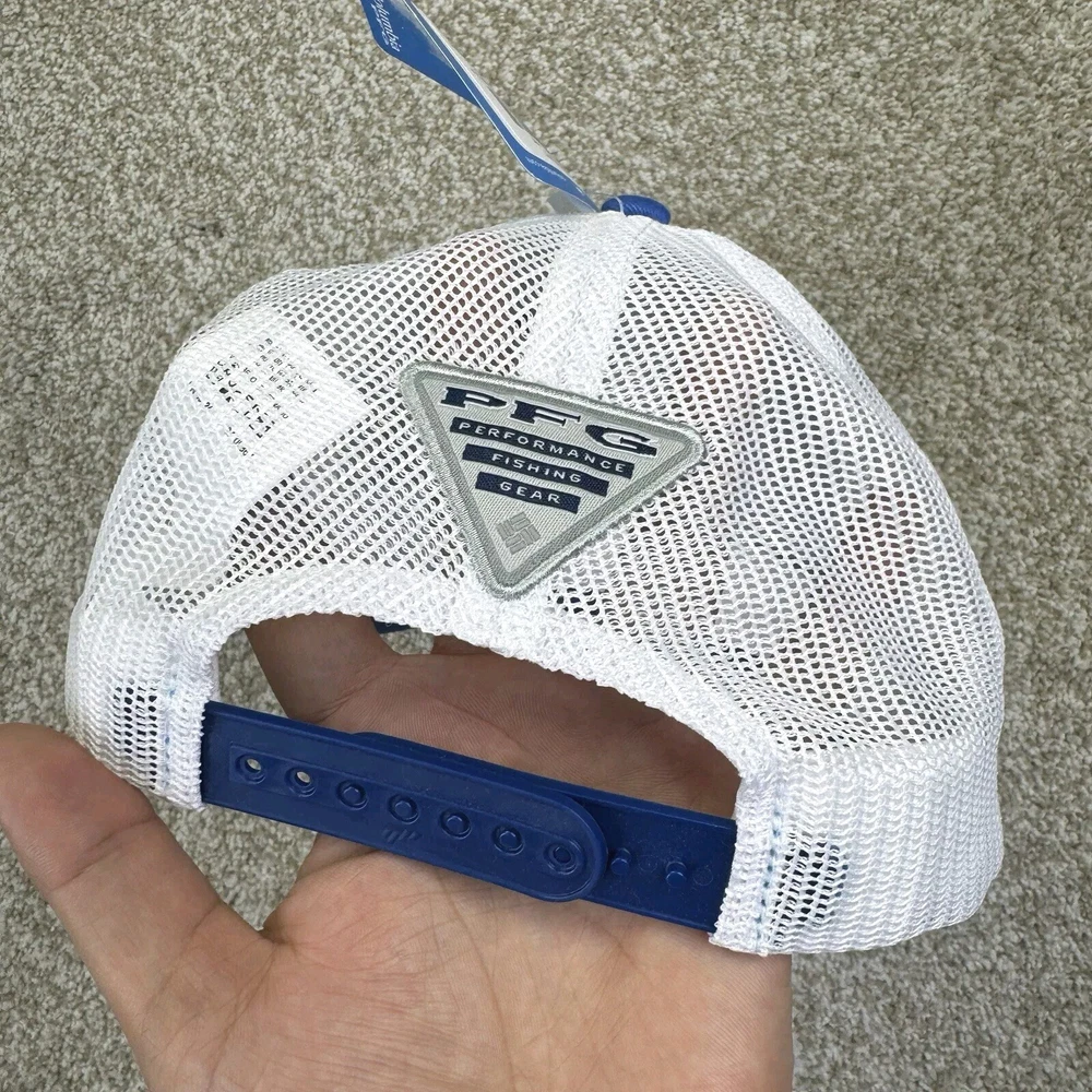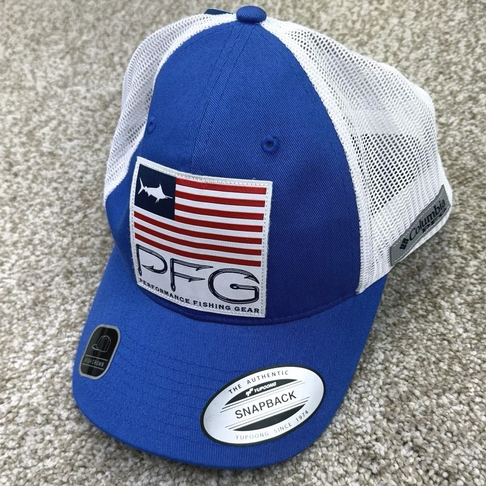 NEW Columbia PFG Trucker Hat Cap Mesh Fish USA Flag Adult Unisex 0/S Blue White. Condition is New with Tags. Shipped Standard. See All Photos With Blemish.