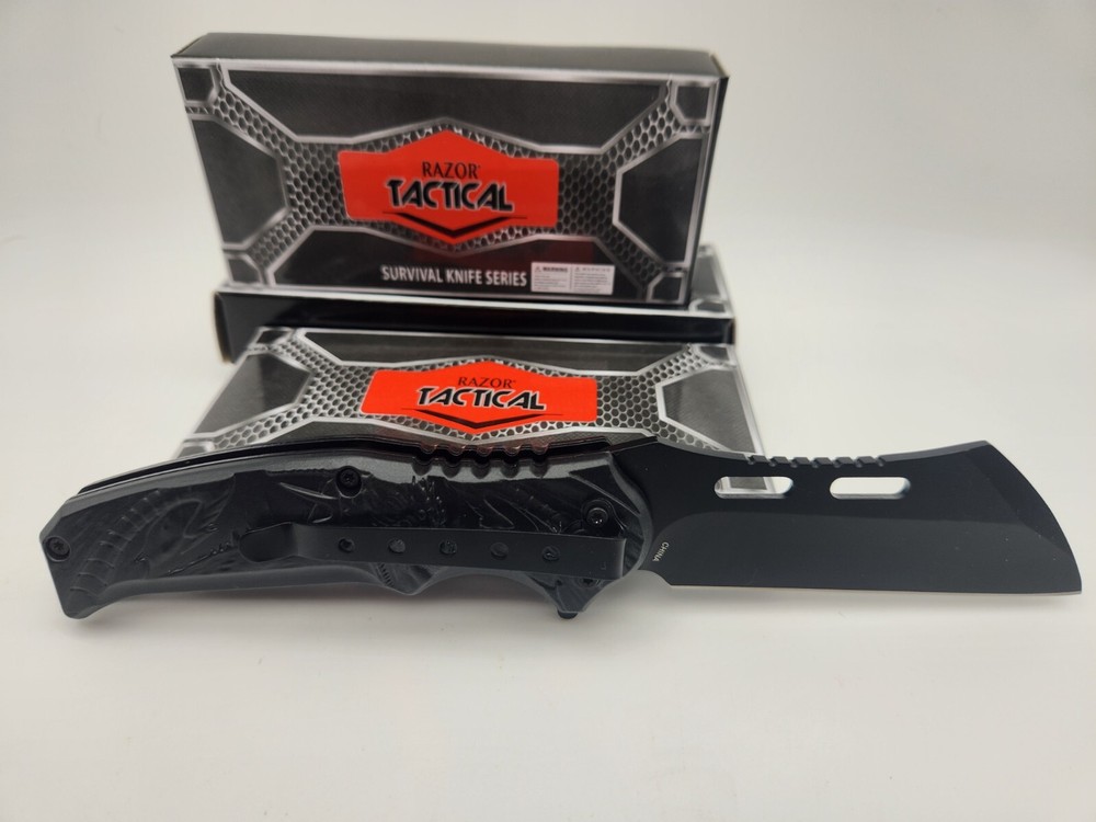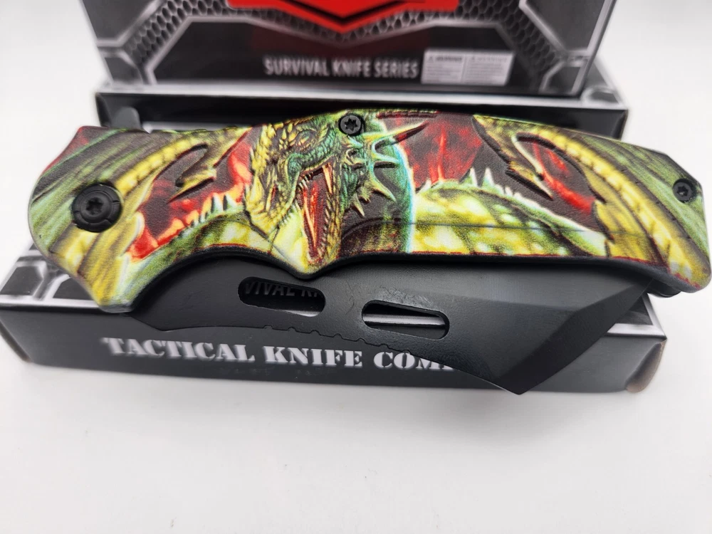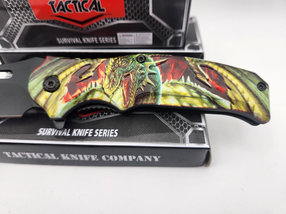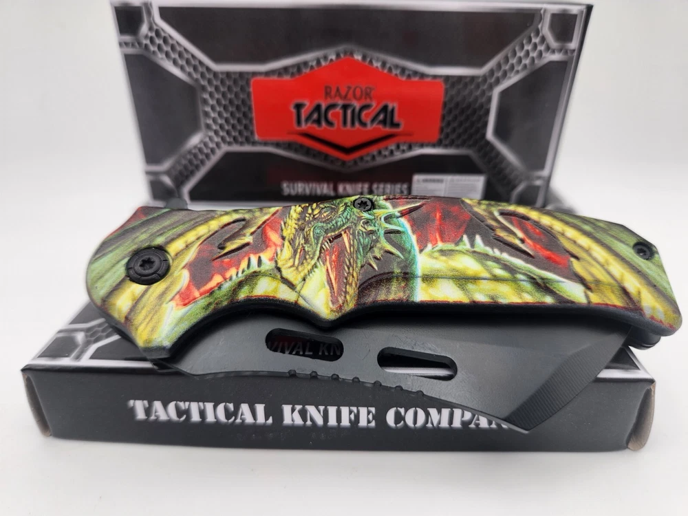 NEW with box! The Dragon Tactical Locking blade Razor Knife is a new, collectible folding knife featuring a 3-inch steel blade with a razor edge. The manual lockback mechanism ensures secure use, while the hard plastic handle in tactical green, yellow, and red colors adds durability. This original knife from the Tactical brand comes with a belt hook and is a must-have for collectors and enthusiasts of modern folding knives. Thanks for looking