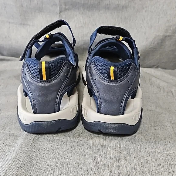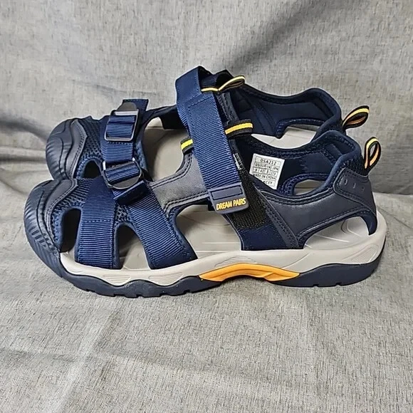 This is a new pair of Dream Pairs men's sport outdoor sandals in navy, size 9. They feature a hook & loop closure, a flat heel, and a fisherman style. These lightweight and comfortable sandals are suitable for summer activities and are made with synthetic materials. The design includes accents of hook & loop and buckle details, with a solid blue color. Perfect for hiking or water sports, these sandals are part of the Dream Pairs product line. Shoes are new in box and never worn. Box has defect on top, but it did not affect the product.