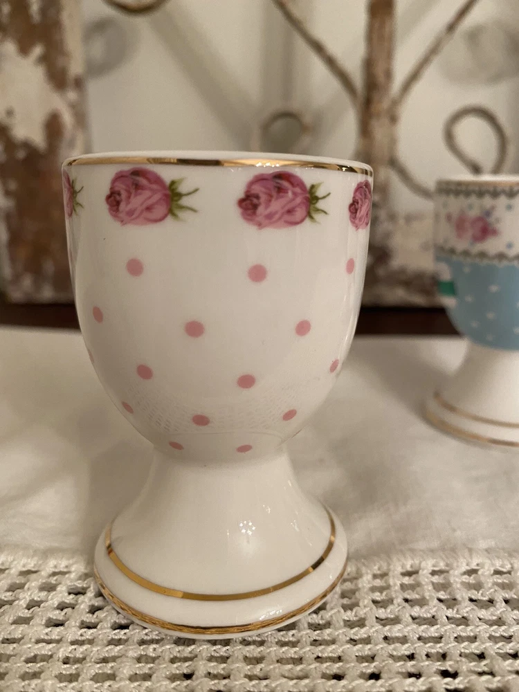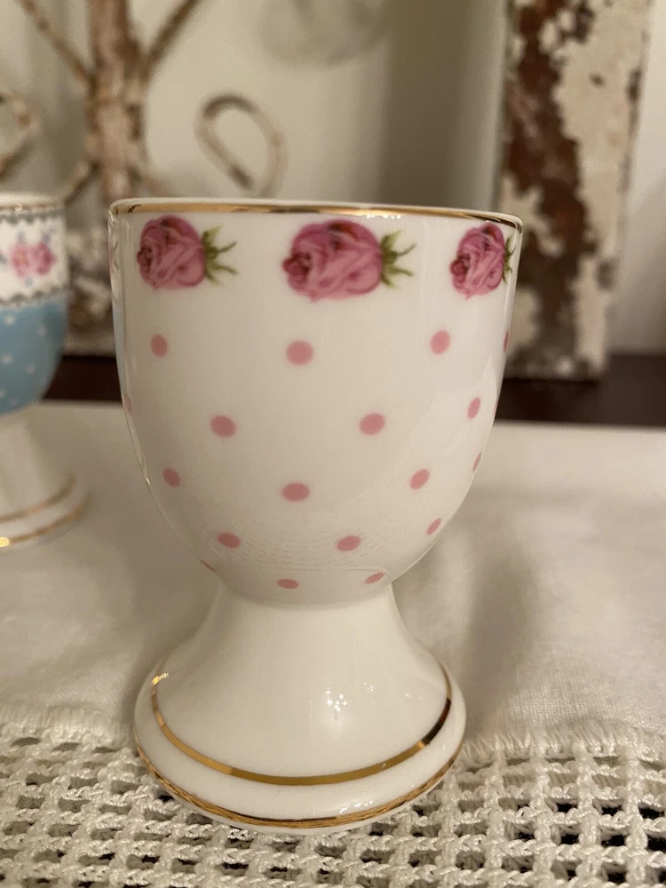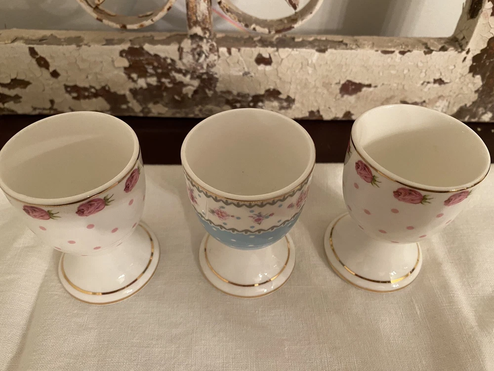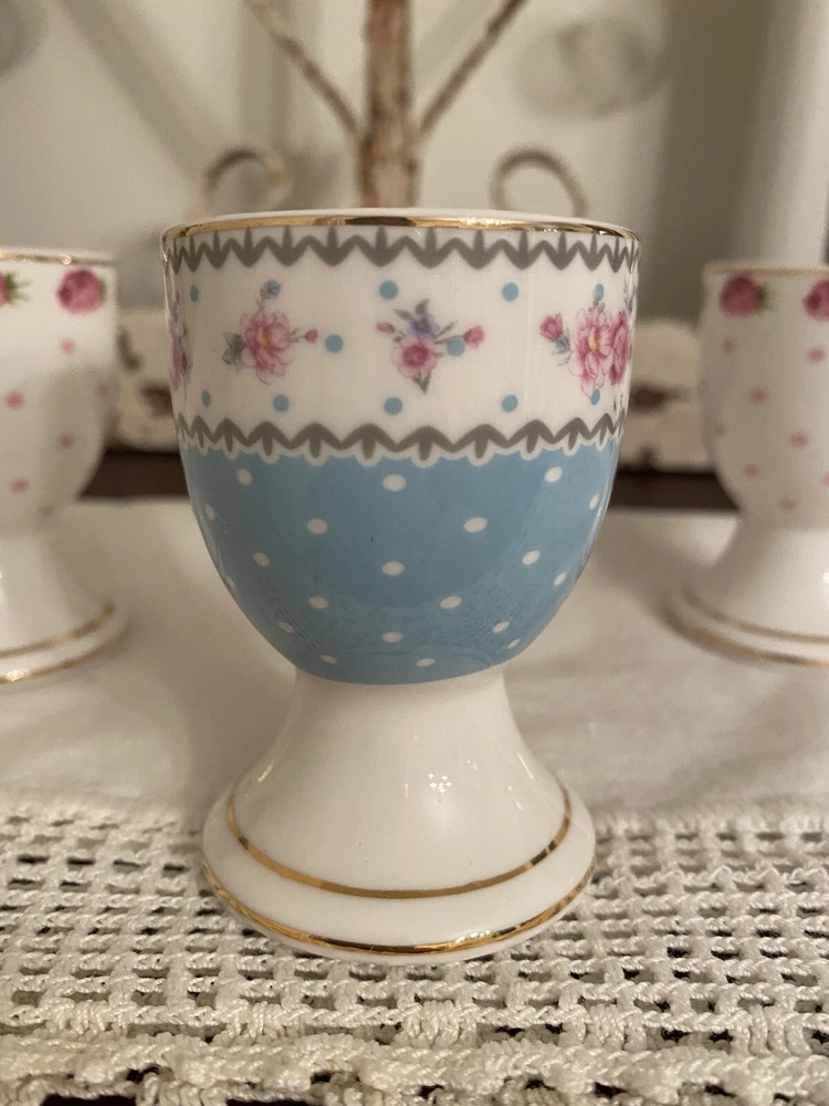 NEW GRACE TEAWARE VICTORIAN WHITE PINK BLUE ROSES EGG CUP HOLDER STAND 3 PC SET. Beautiful condition, no chips or cracks.