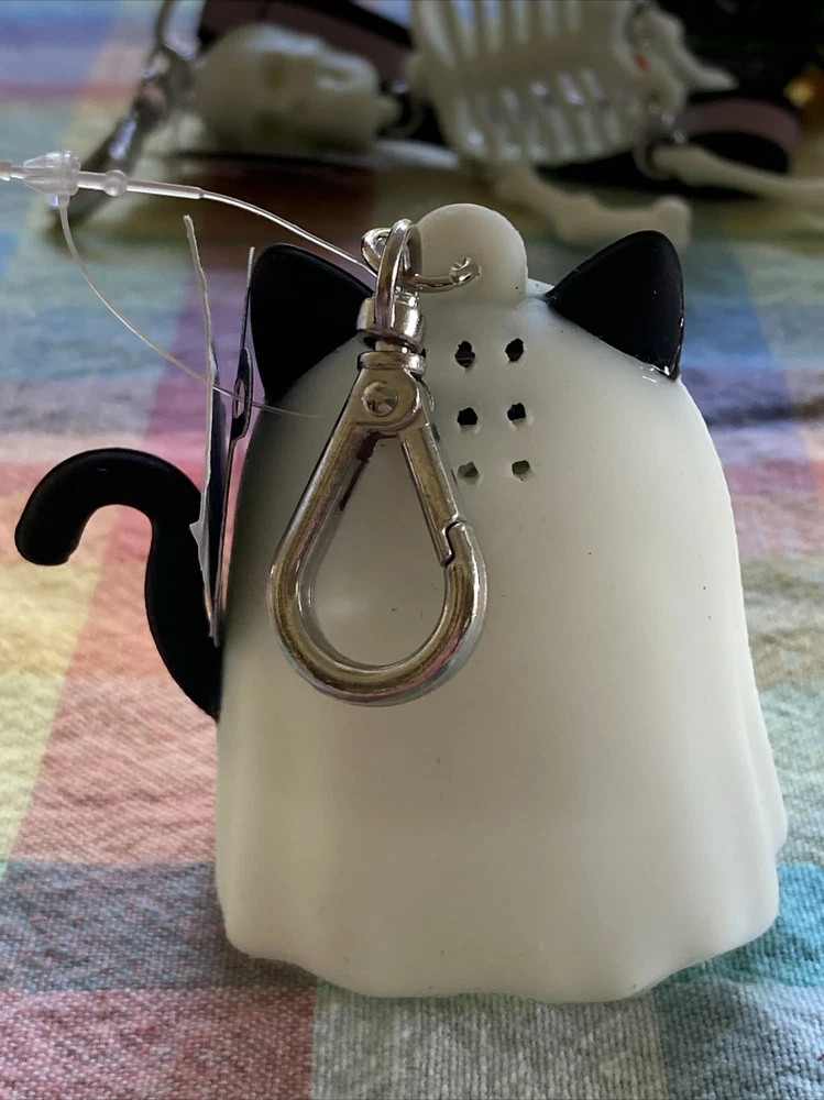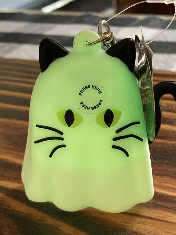 Up for grabs is this Glow-in-the-Dark TALKING GHOST KITTY CAT POCKETBAC HOLDER. NEW NEVER USED except for testing the sounds. Super cool! Sound is of kids saying “TRICK OR TREAT “ with a kitty meow at the end. All my items come from a smoke & gander free environment. I also combine shipping costs upon request. Check out my other HALLOWEEN ITEMS!