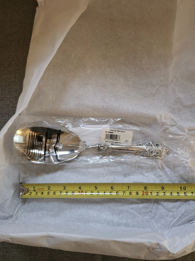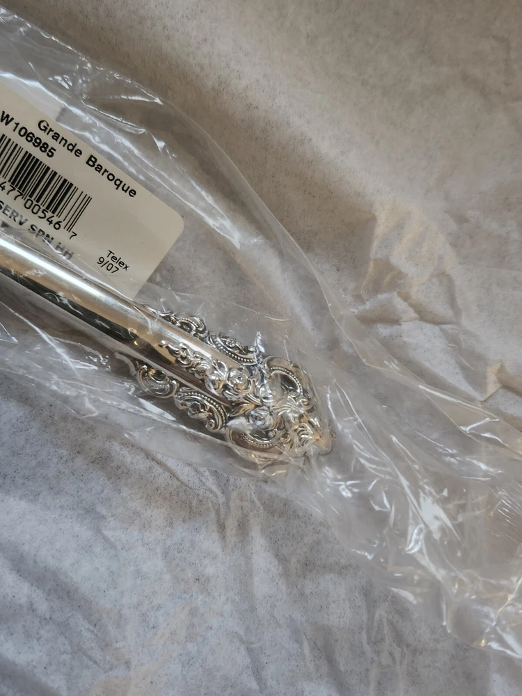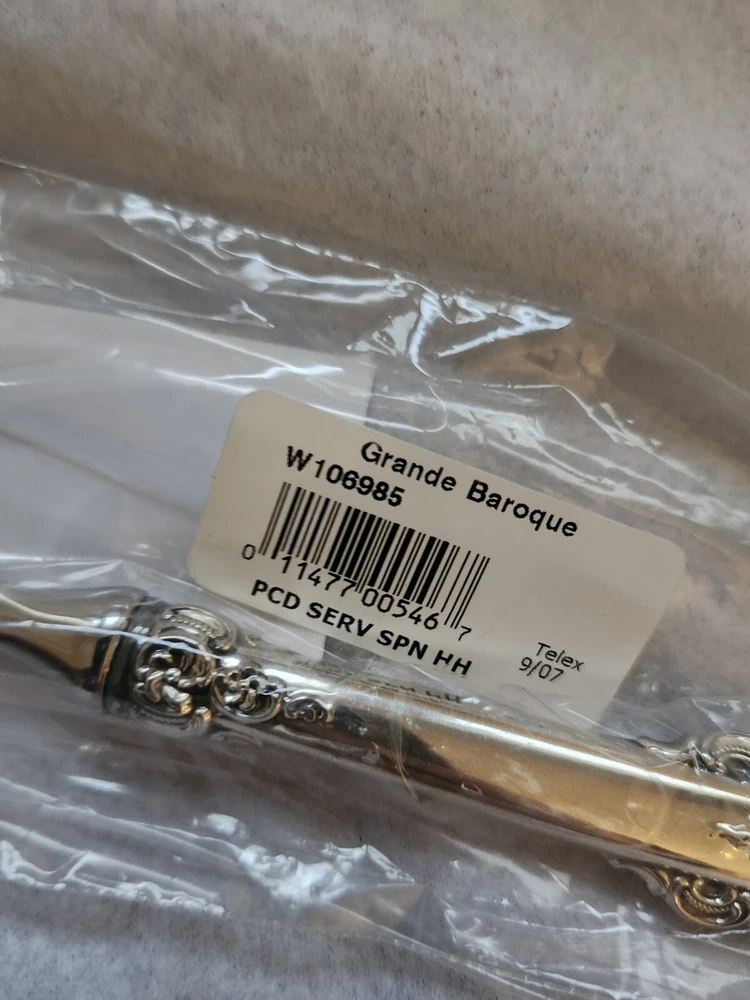 Experience the elegance of the Wallace Grande Baroque sterling spoon, a timeless addition to your servingware collection. With its intricate shell motif and lustrous finish, this piece exemplifies the intricate craftsmanship of post-1940 silverware. New sealed in the plastic. Handle only is sterling. Crafted from high-quality sterling silver spoon is a testament to the enduring beauty of classic design. Its heritage is reflected in the renowned Wallace maker's mark, ensuring authenticity and value. Whether used for special occasions or as a standout display piece, this spoon promises to be a cherished heirloom.