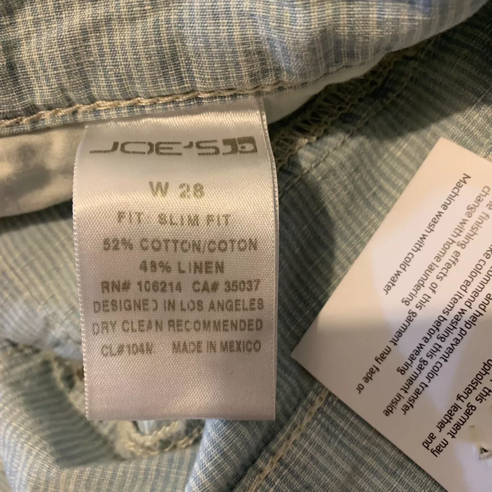 NEW Joe’s Jeans Weekender Collection Sky Blue Striped Linen Blend Pants - 28 New with tags! Slim fit 5 pocket design Zip fly with button closure Soft and lightweight Half-waist: 16" Inseam: 32" Length: 41" Rise: 9" Measurements are lying flat, and estimates only. 3P30 48-4655 11 oz