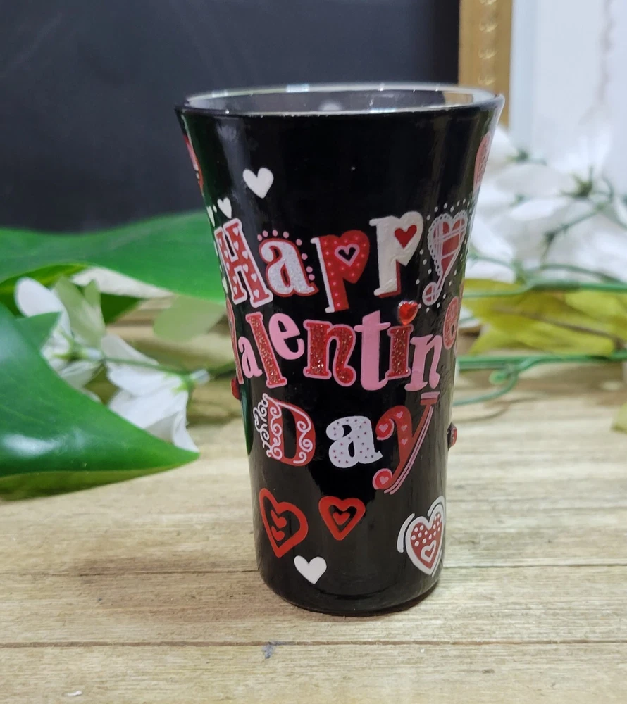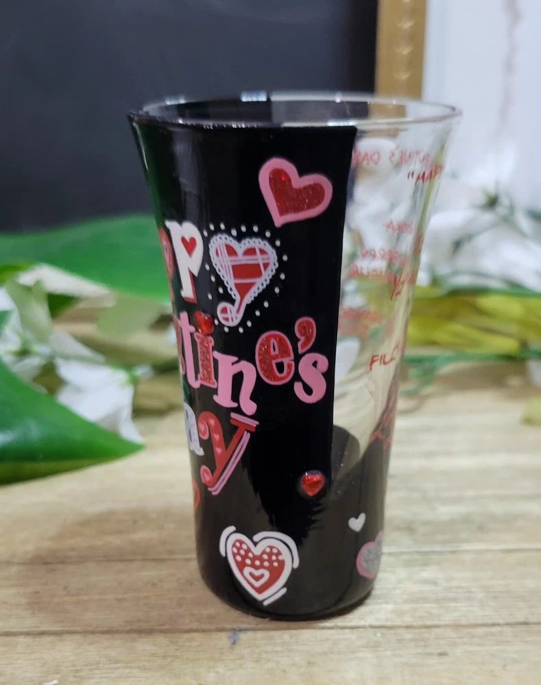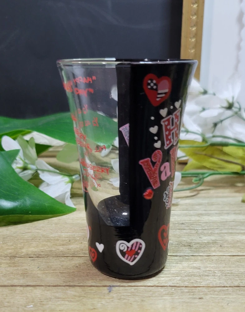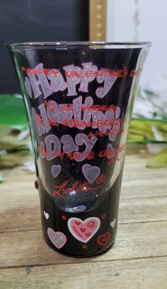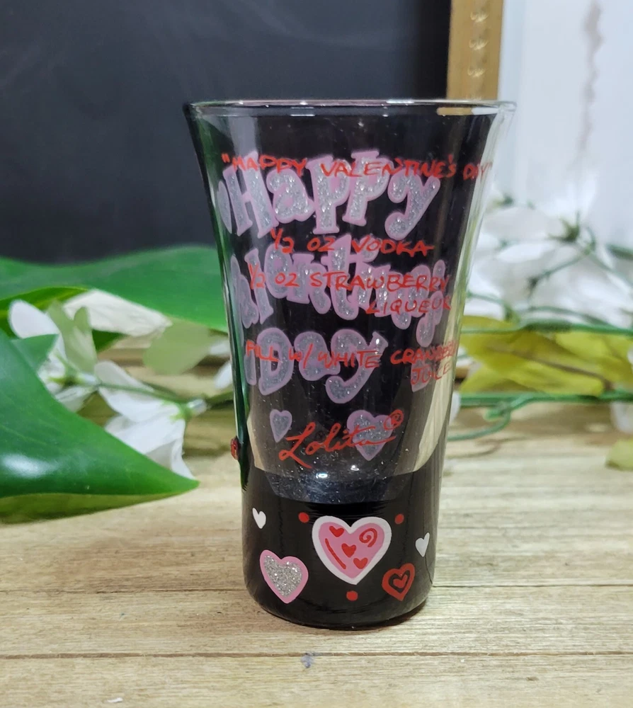 NEW Lolita Happy Valentine's Day Shot Glass with Hearts in Original Box. Condition is New in original package and box. Piece is your traditional looking shot glass size with a black transfer design with Happy Valentines Day and hearts in the colors pink and white. Nice looking piece that makes a perfect gift for your Valentines Day. Shipped with USPS Priority Mail.